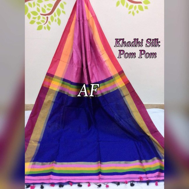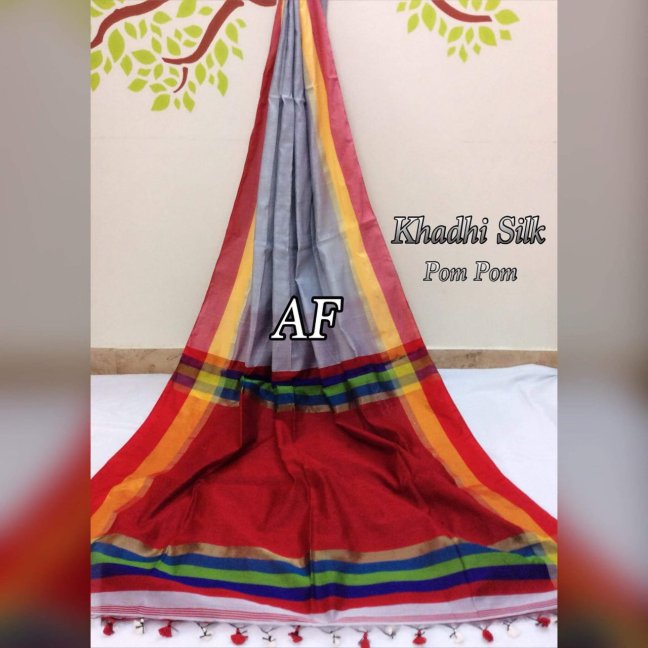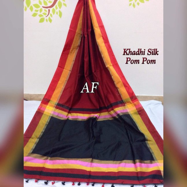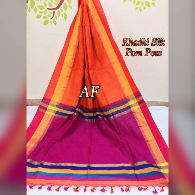 ‼Be a Trend Setter with our Khadhi Silk Saree with graceful Border on Both Sides. Contrast Blouse and also contrast Pretty Pallu. Highlighted with Pom pom Tussels.