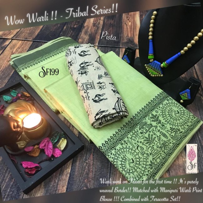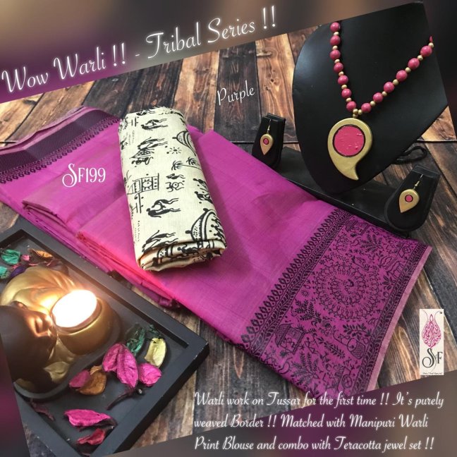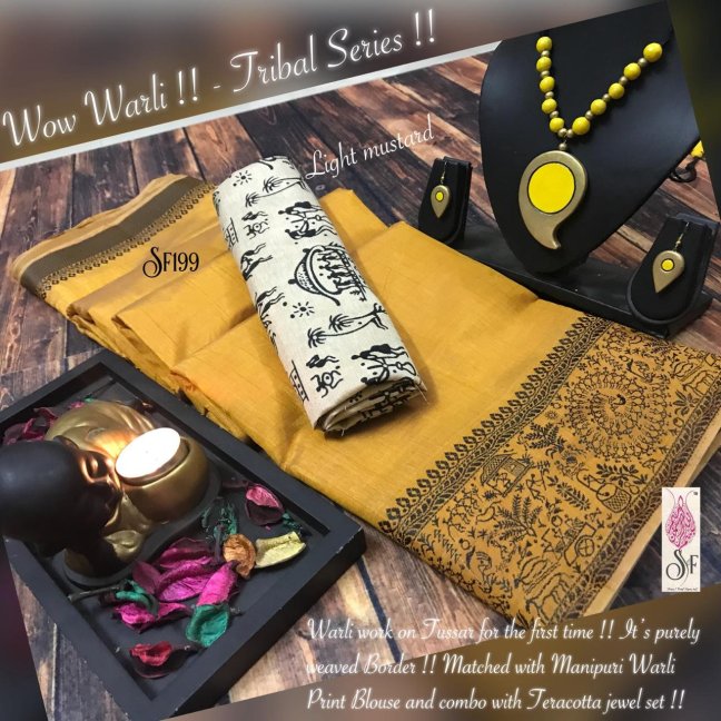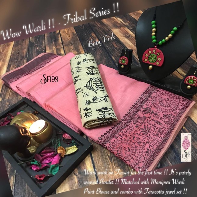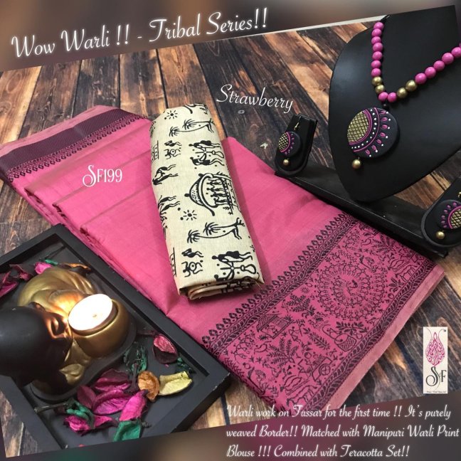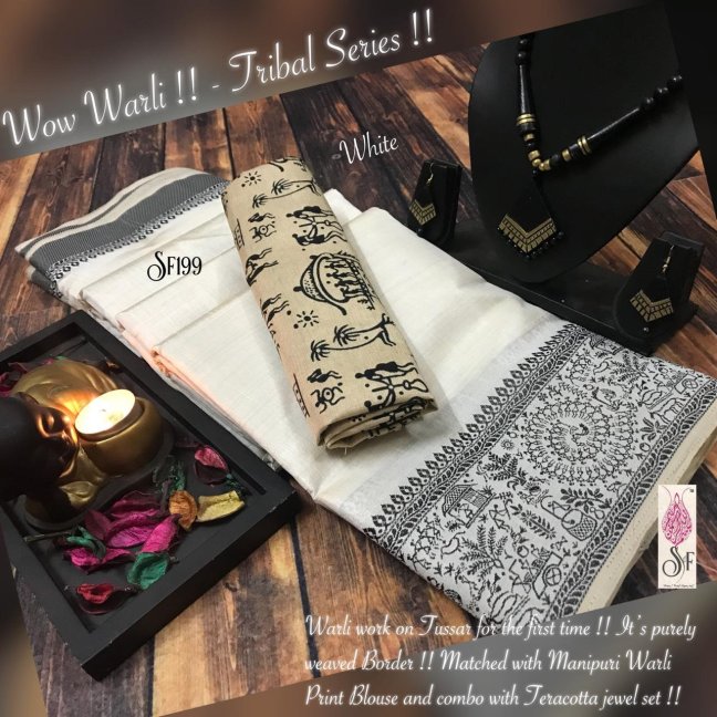 Tussar Silk with Warli border !! it’s purely weaved Warli on Tussar combo On 9 Vibrant shades !! trendy Manipuri Warli Blouse !!