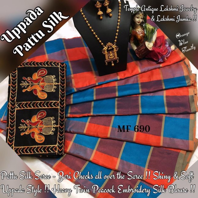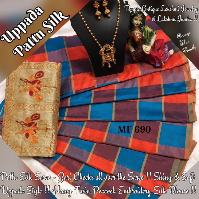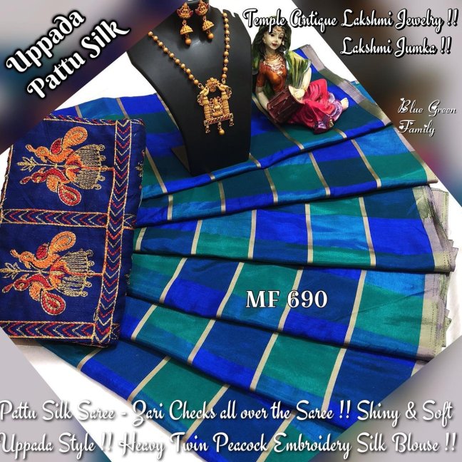 Pattu Silk Saree hav Double Colour Family Checks & Zari lines all over the saree !! Heavy Twin Peacock Embroidery in Silk Blouse !! Antique Temple Lakshmi Jewelry !!