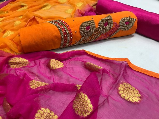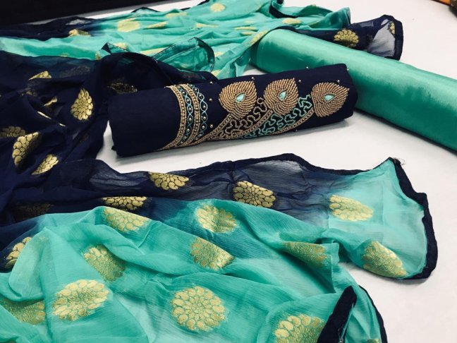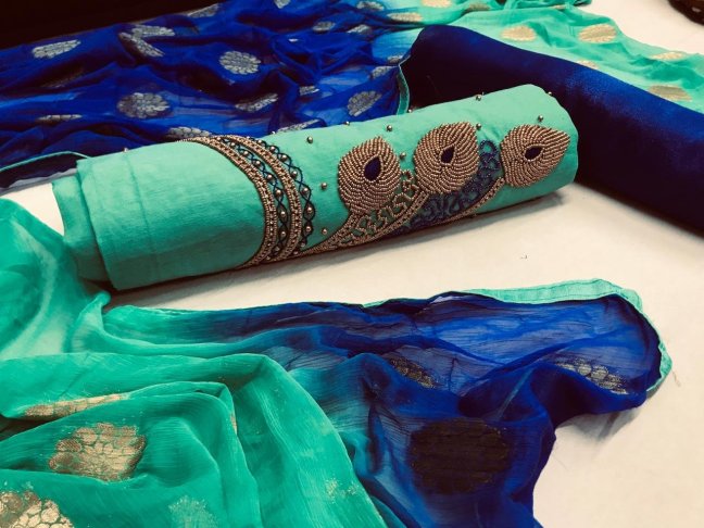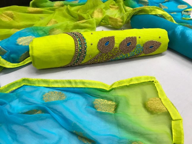 Presenting new designer feather designe with attractive color and handwork neck with designer lace at bottom of top