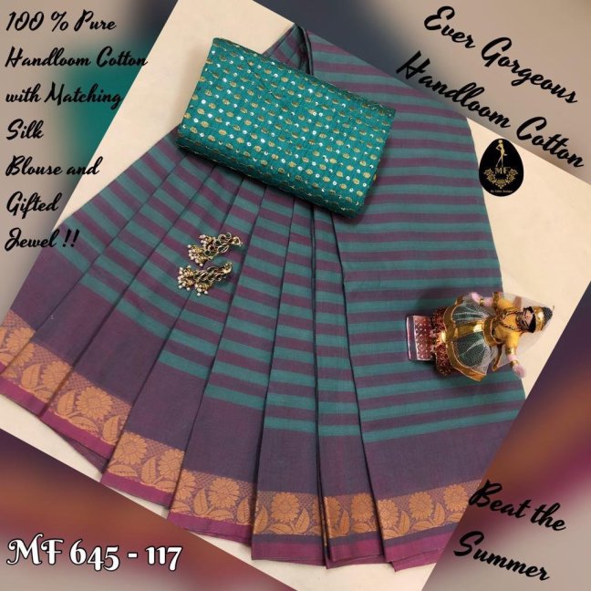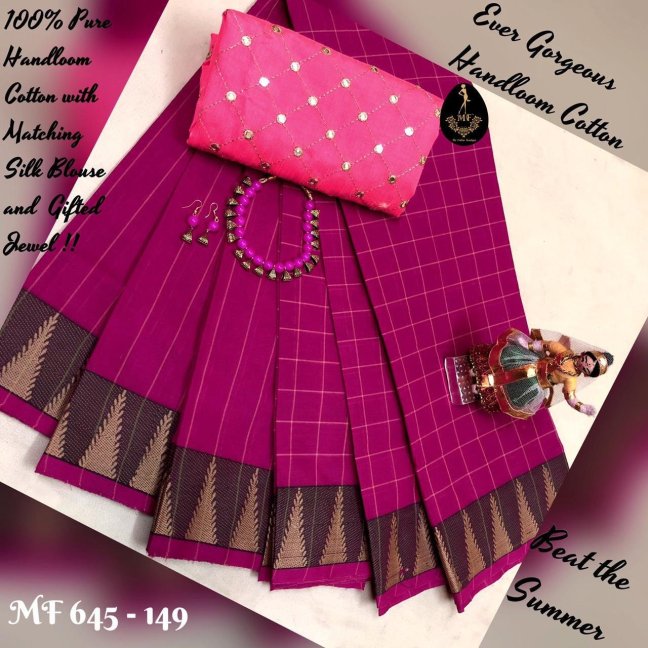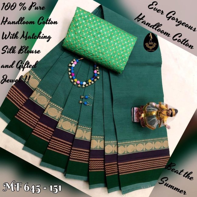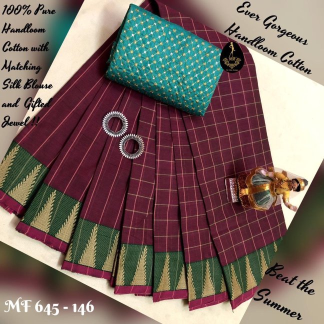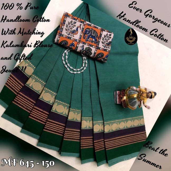 Chettinad Cotton With New Different Pattern of Border !! Combo over with Kalamkari or Silk Blouse & Matching Jewels and Hand Bag