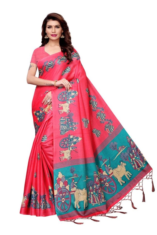 SOFT SILK FABRIC WITH TRADITIONAL PEACOCK And CHAKRA PRINT BORDER N CONTRAST PRINTED BLOUSE AND RICH ELEGANT PALLU