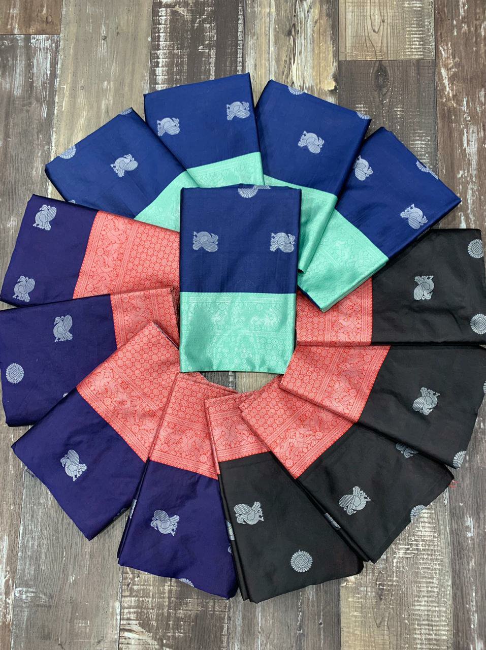 A beautiful borderless silk kanchivaram with deepest N blue body with contrast aqua green pallu and blouse. The body is woven with mayil chackaram motifs and Rich woven silver zari pallu.*Price OnLy : 799/- free shipping