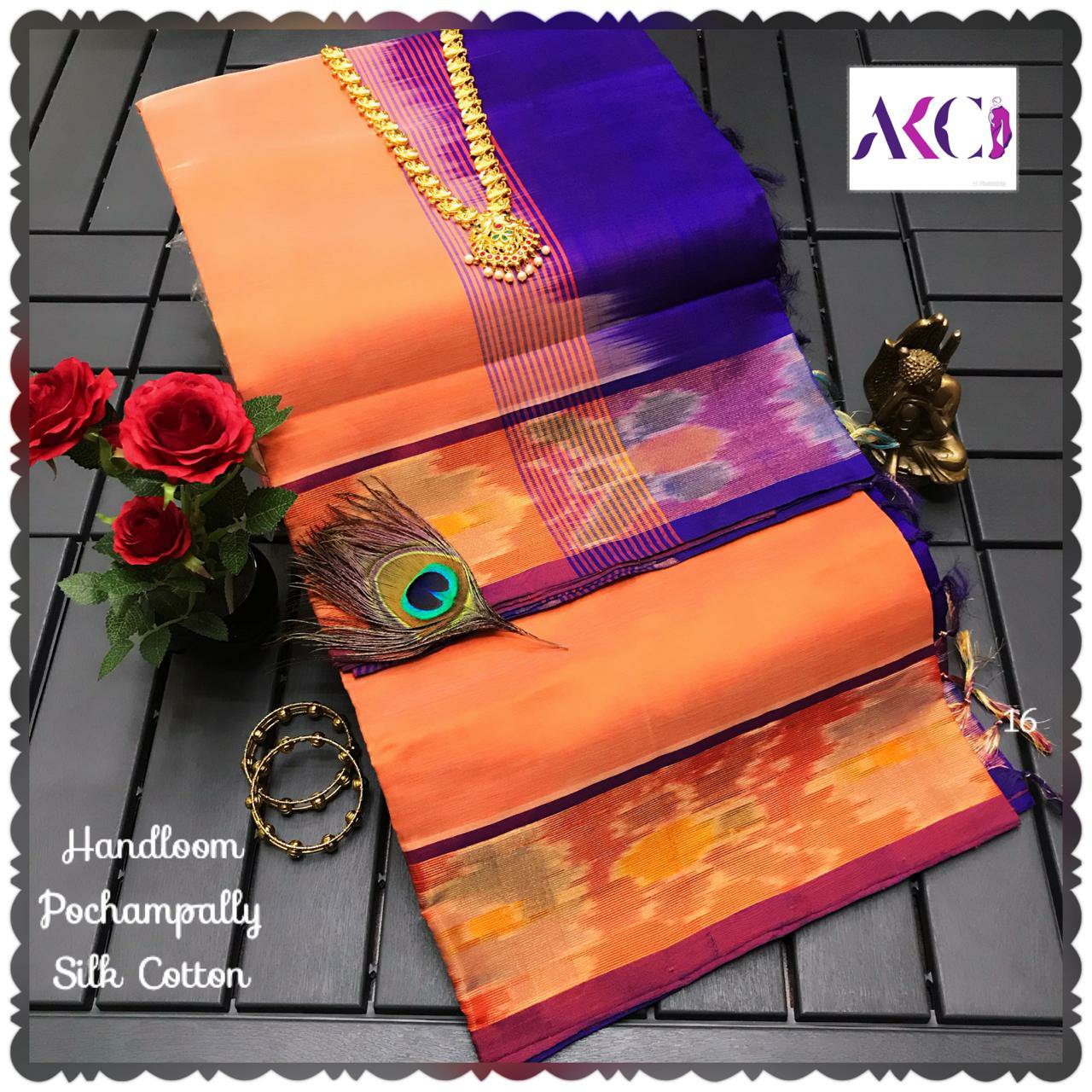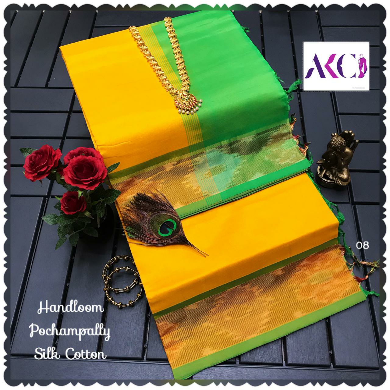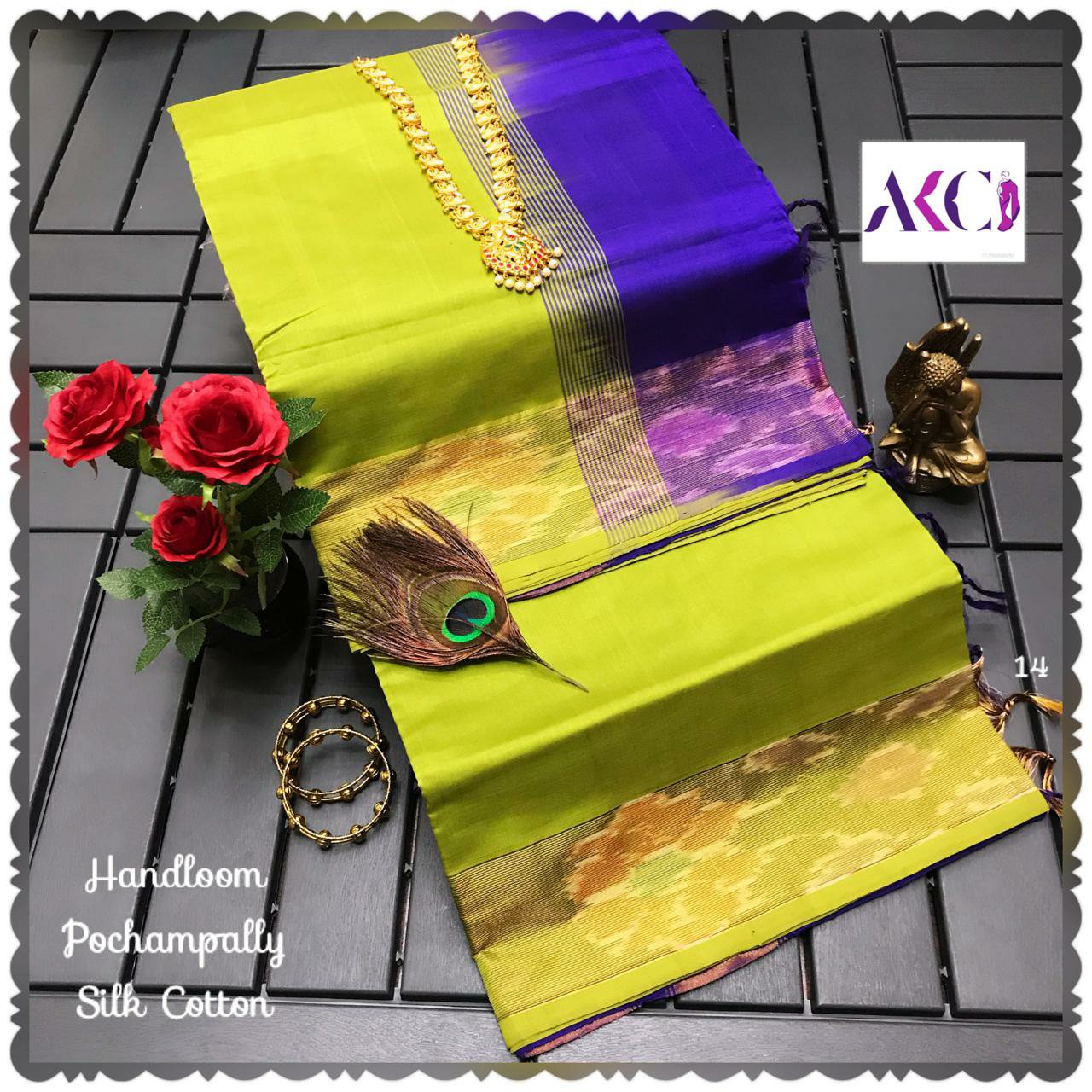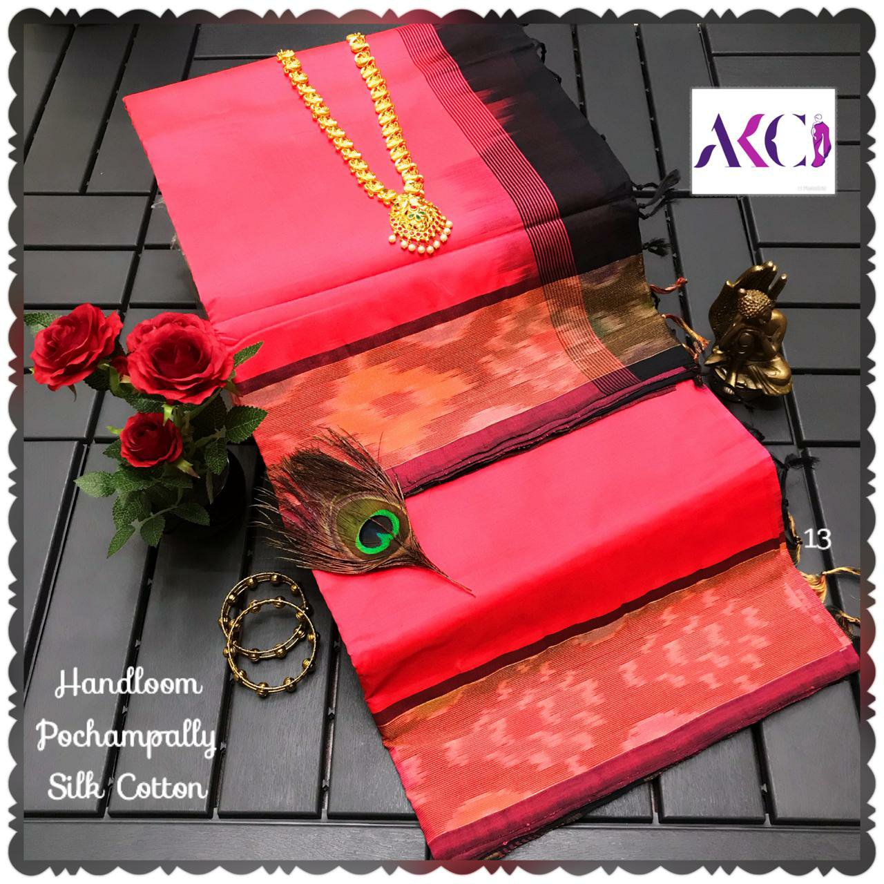 These handloom Sarees are weaved with lavishing Color combination to make u look elegant and traditional with contrast Pallu and double side pochampally border 01
