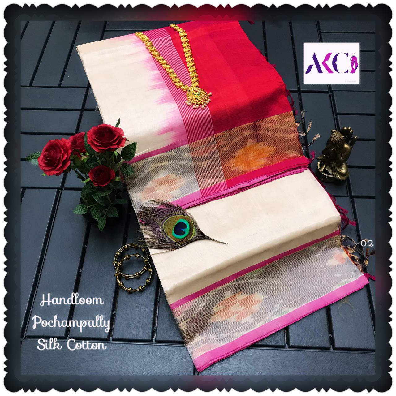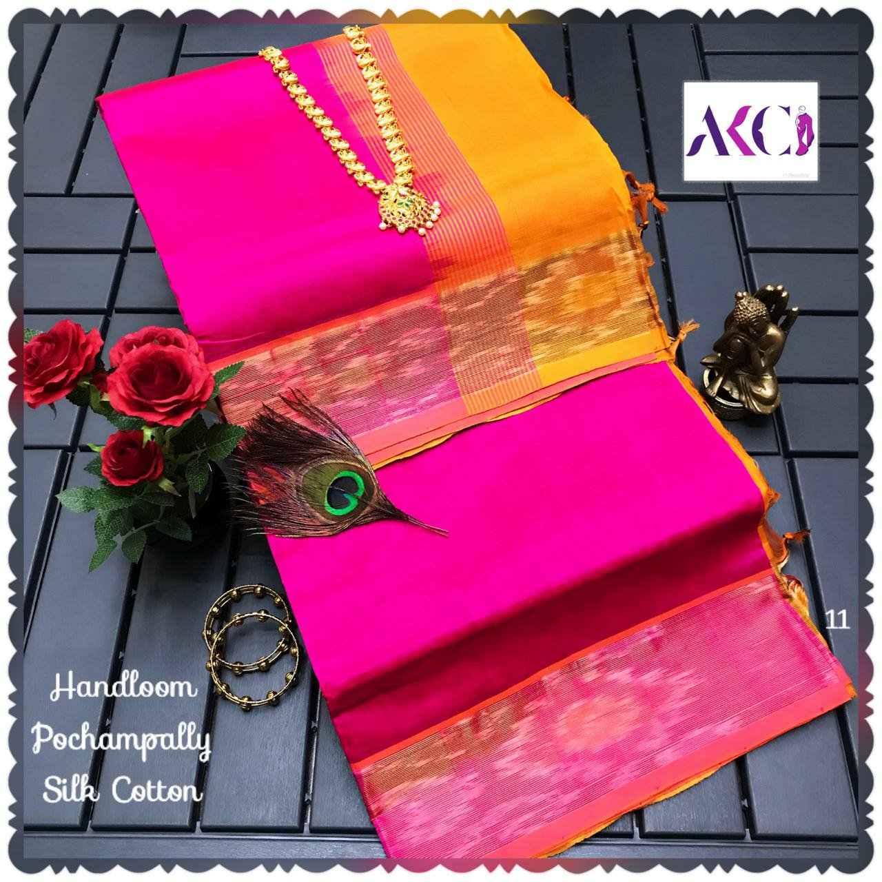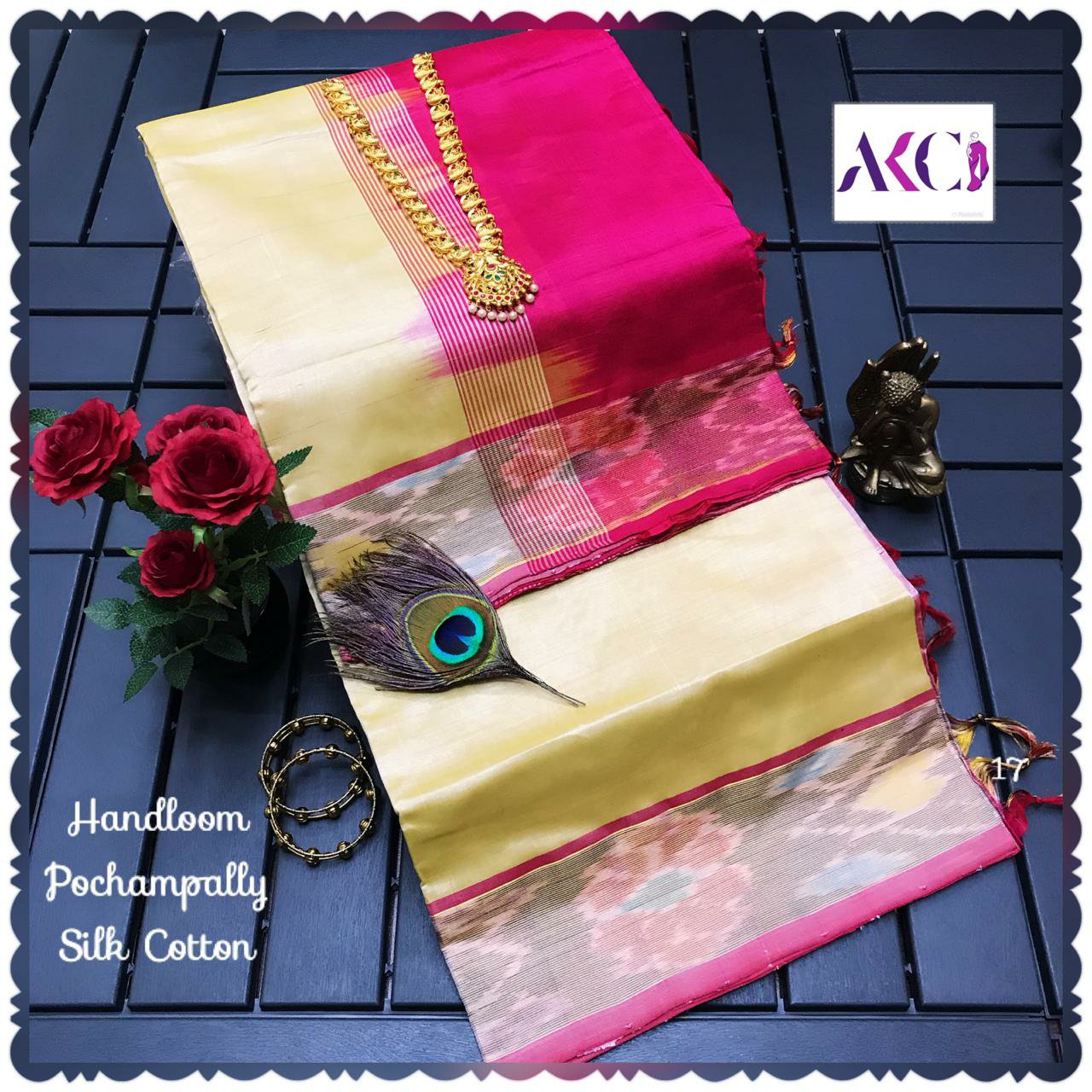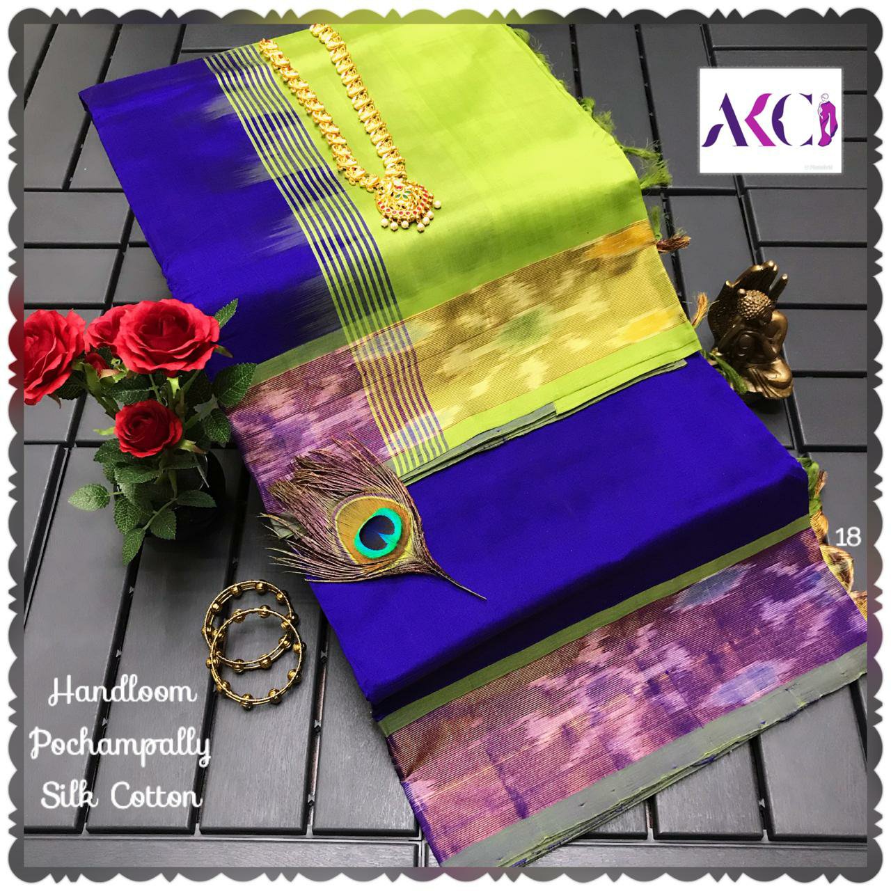 These handloom Sarees are weaved with lavishing Color combination to make u look elegant and traditional with contrast Pallu and double side pochampally border 01
