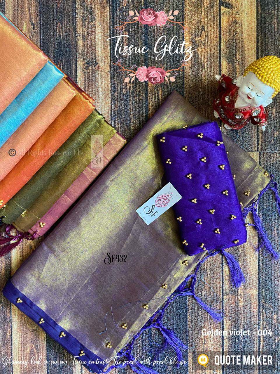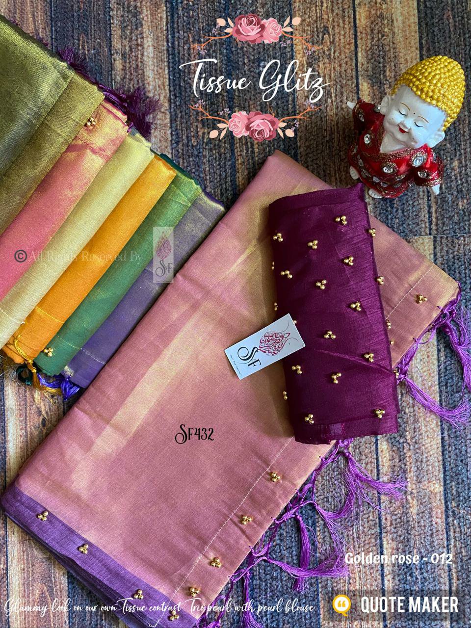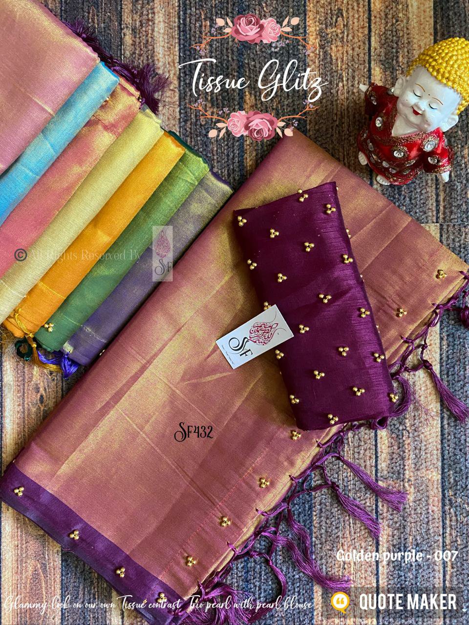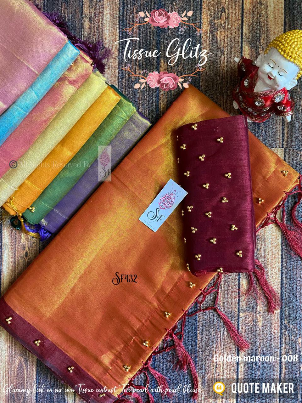 Go Trendy ! Celebrate with our Elegant New Tissue with Galmy border !! Matched with our trio pearl Handwork Blouse !!