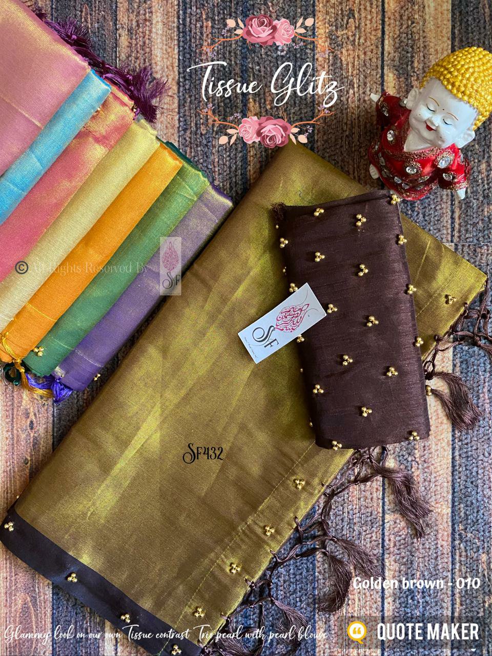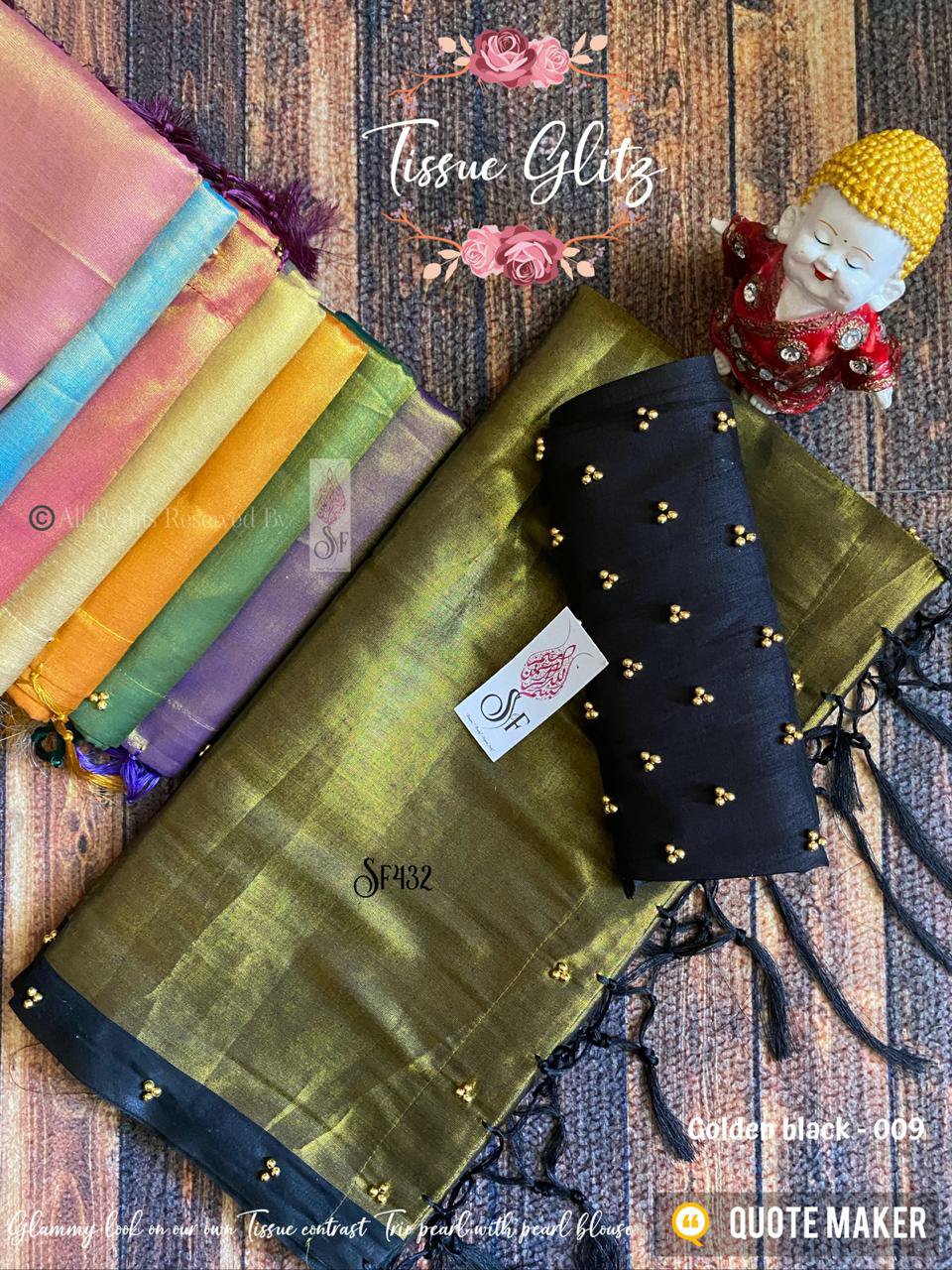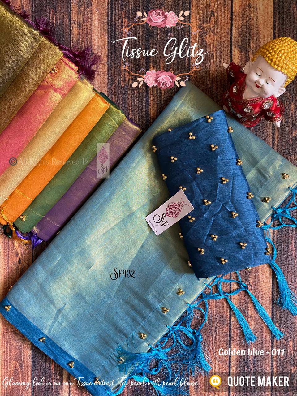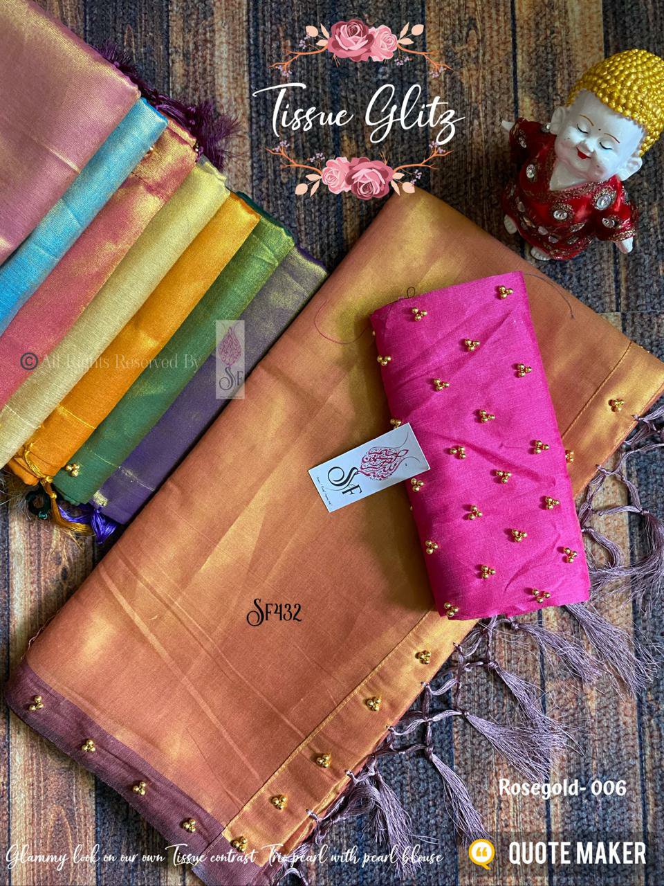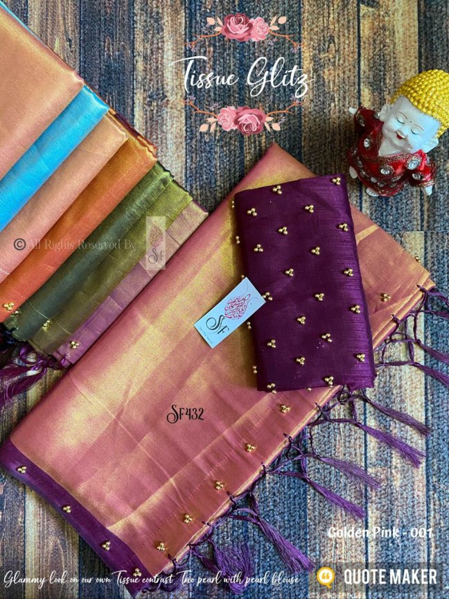 Go Trendy ! Celebrate with our Elegant New Tissue with Galmy border !! Matched with our trio pearl Handwork Blouse !!