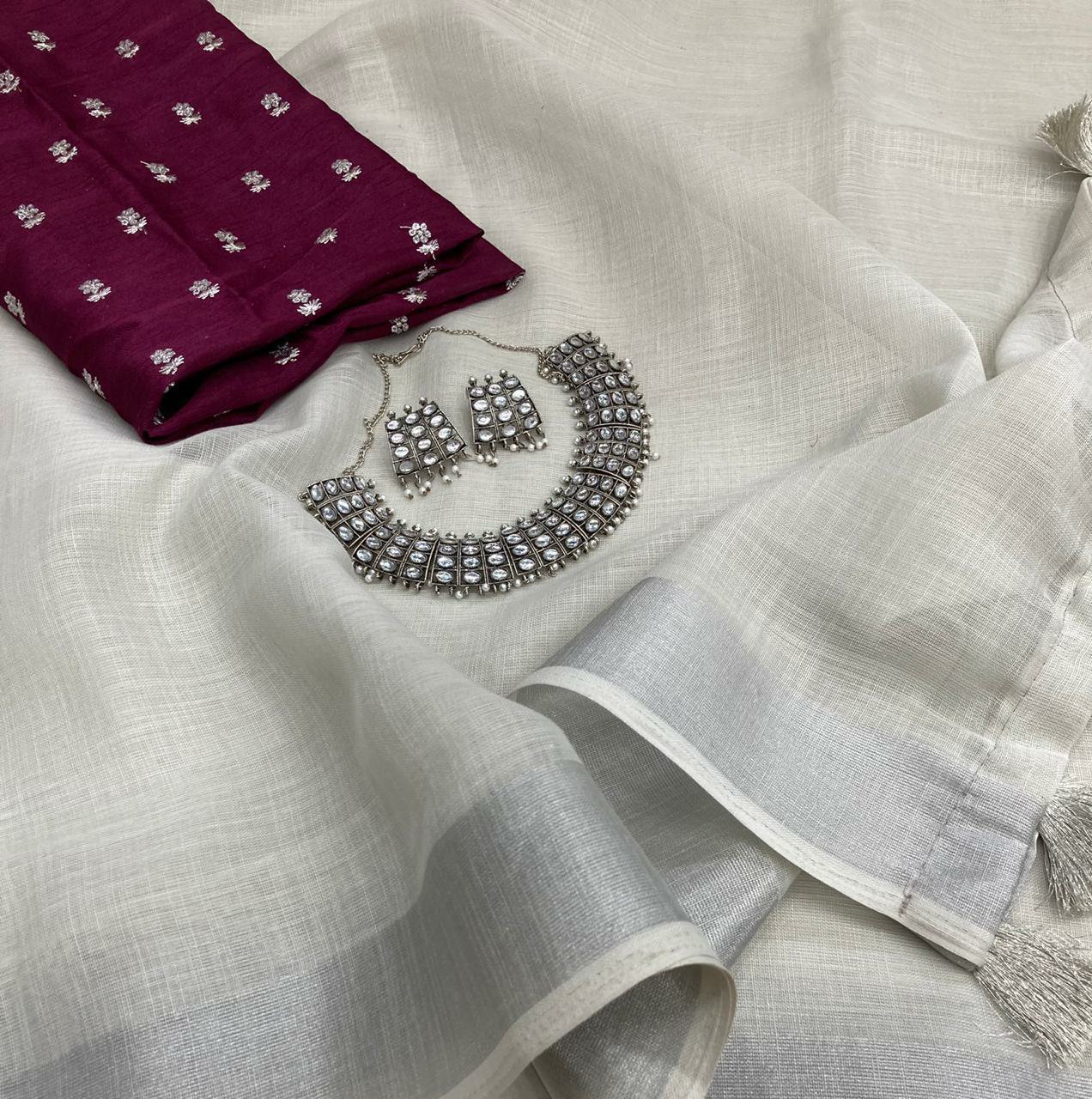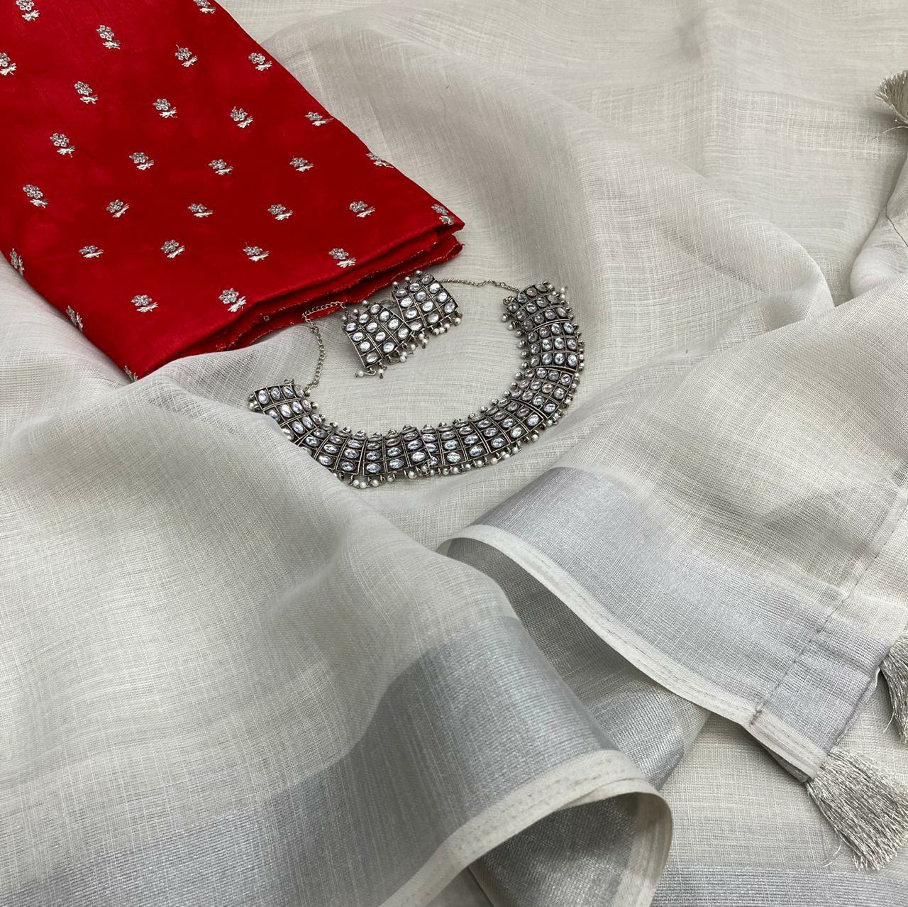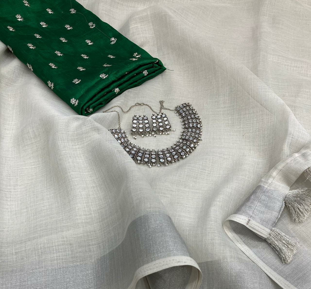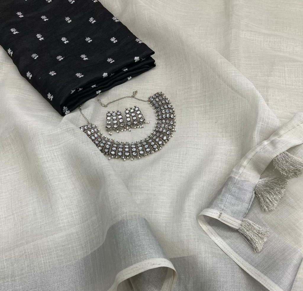 Quality – grey colored linen saree with silver zari weaving pattu boder