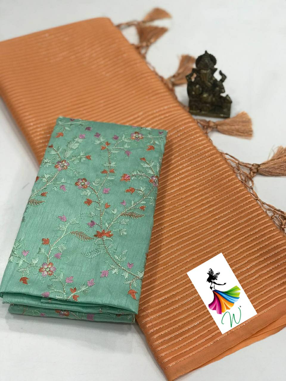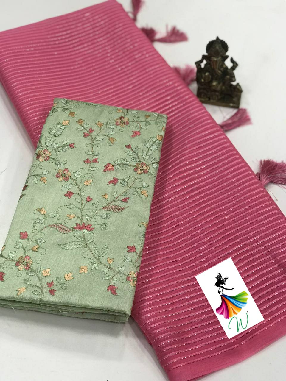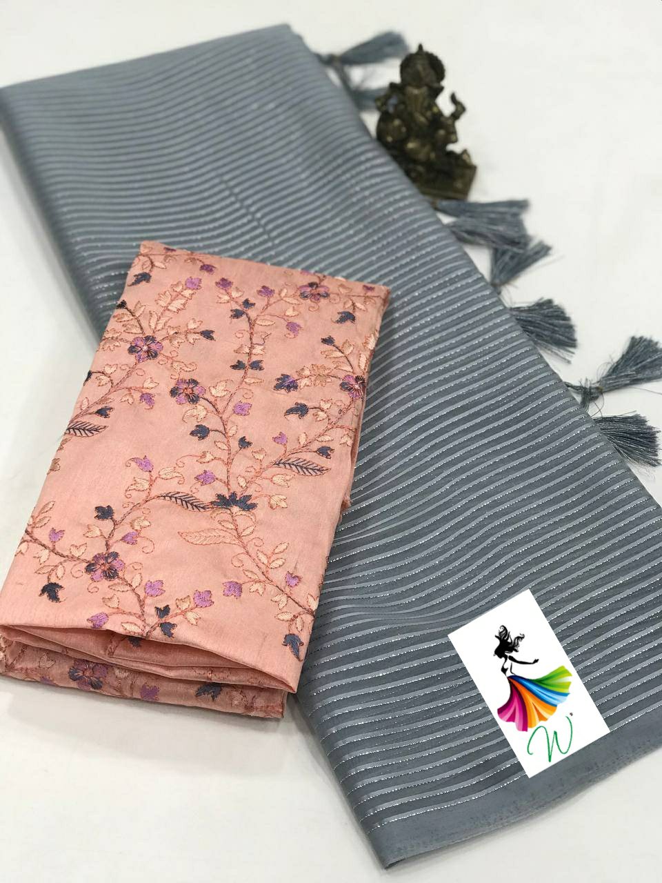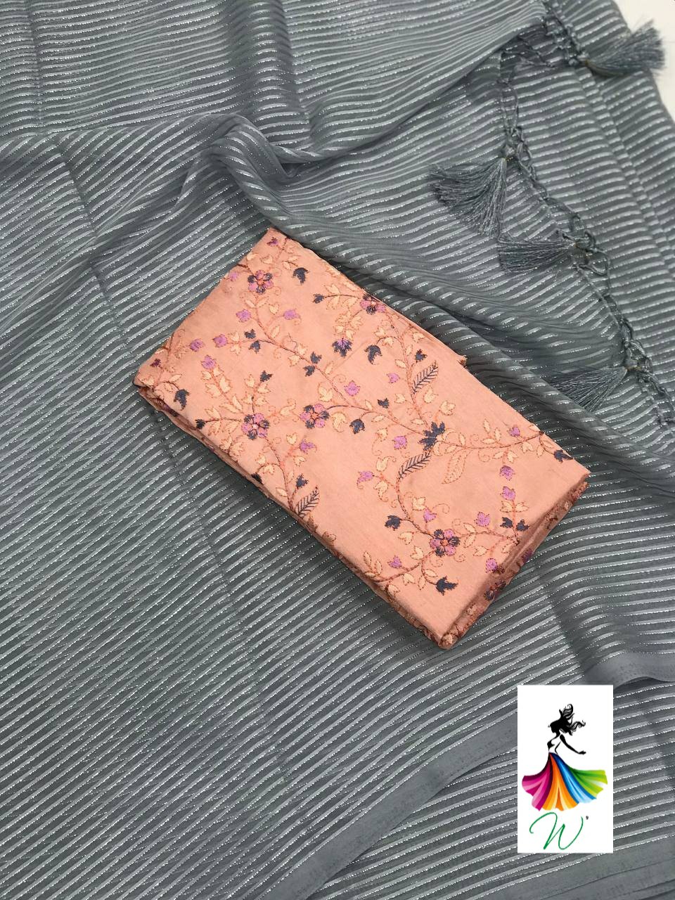 Chiffon Fabric with satin Line all over the saree with tassels and Contrast Net Embroidery Blouse