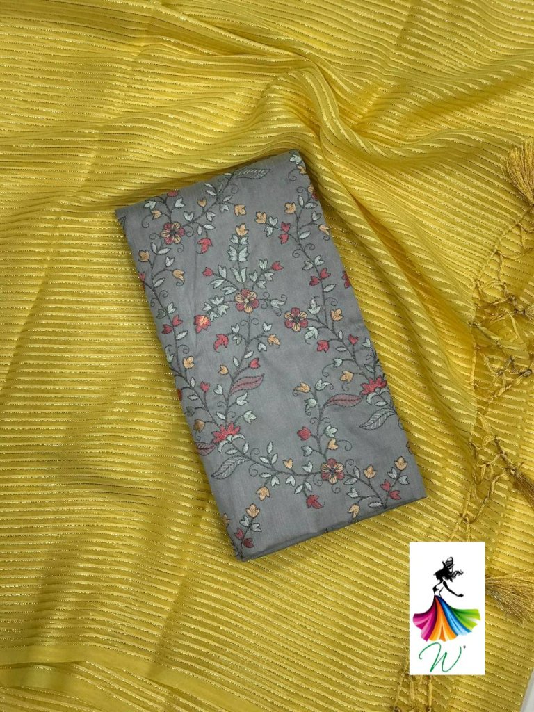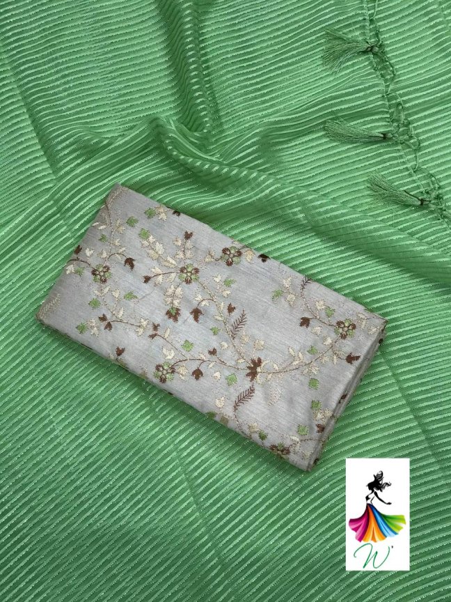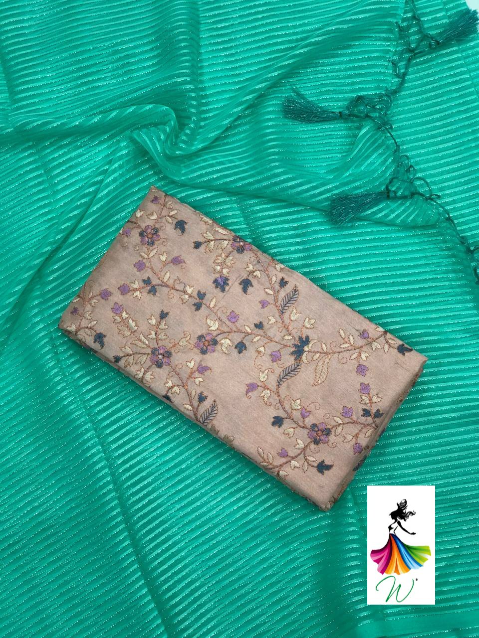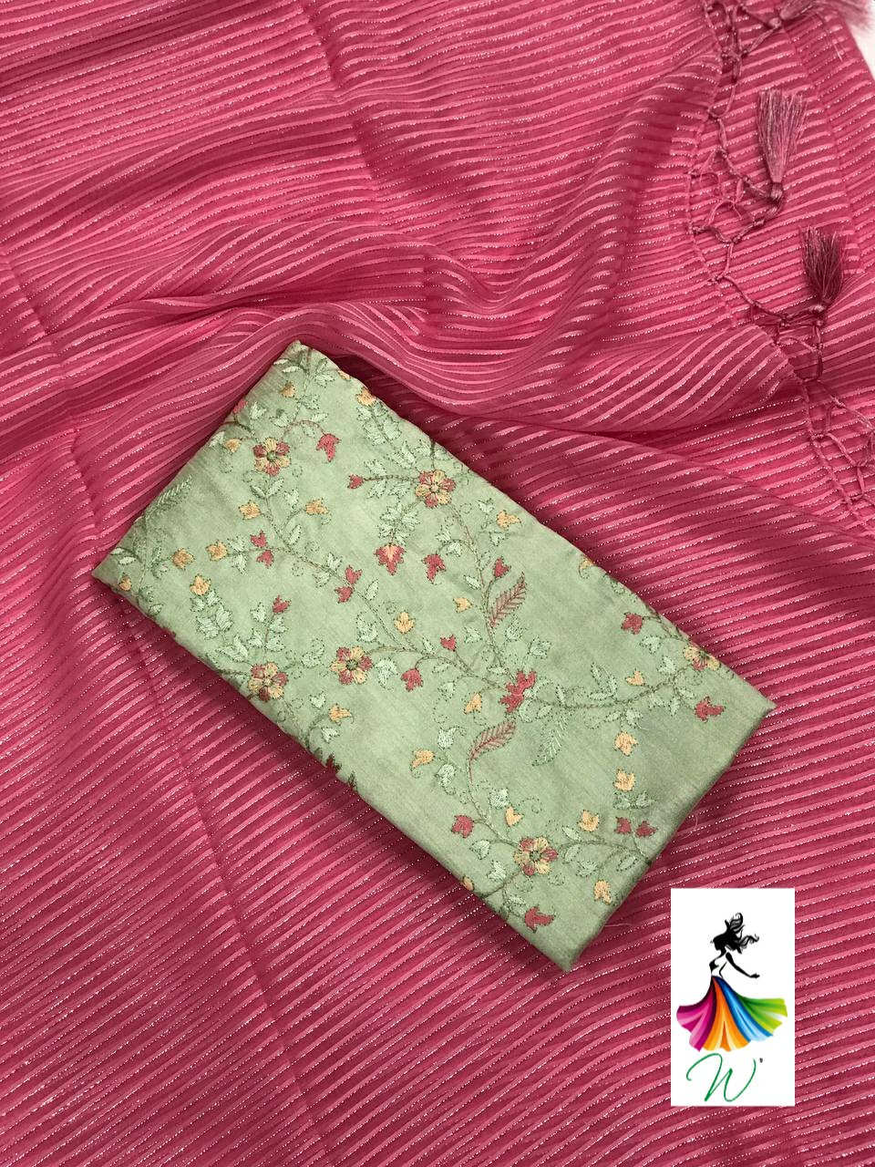 Chiffon Fabric with satin Line all over the saree with tassels and Contrast Net Embroidery Blouse