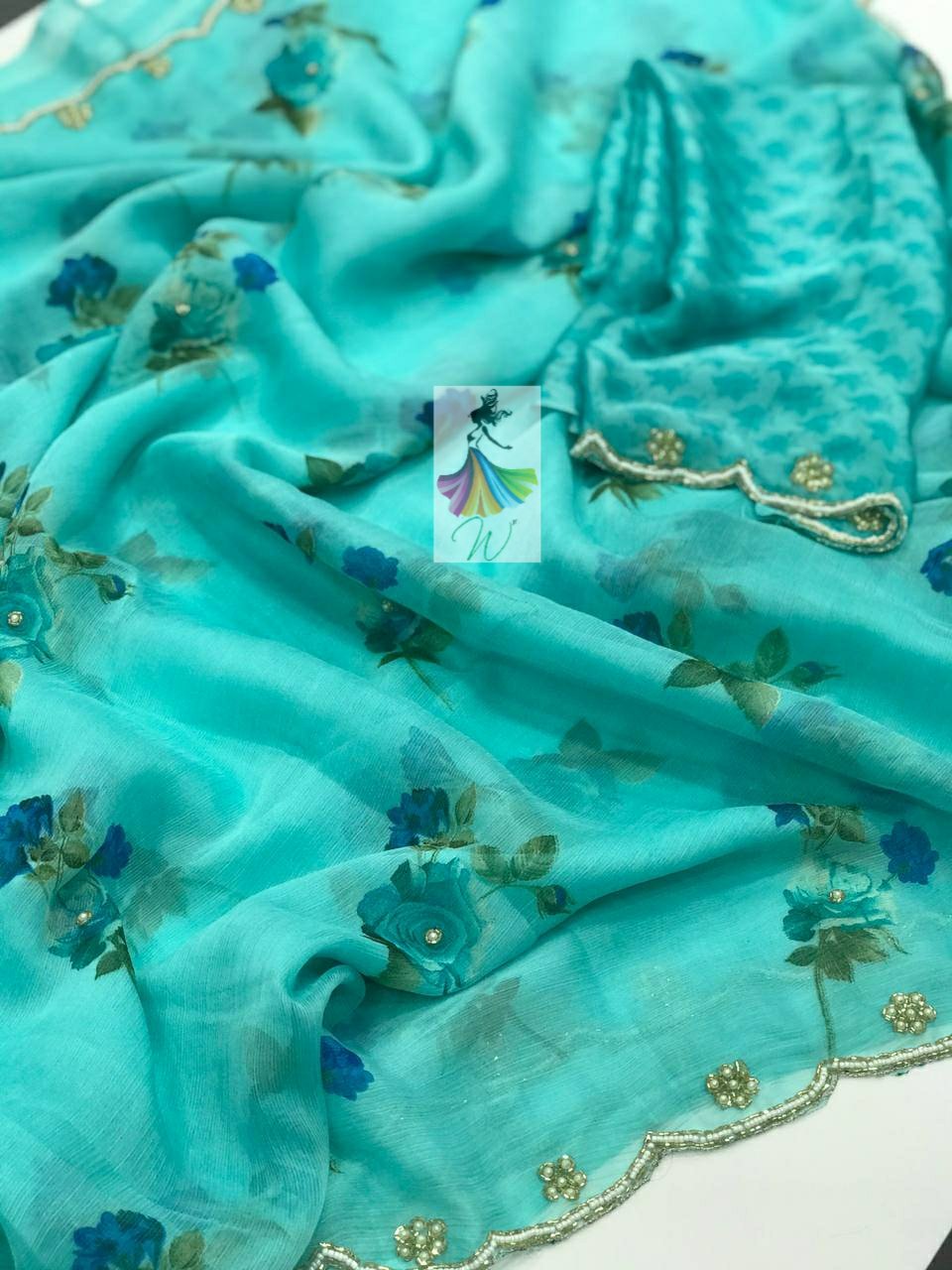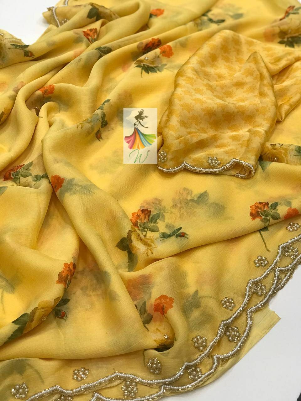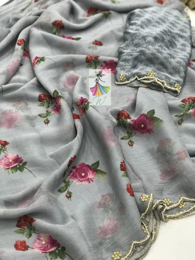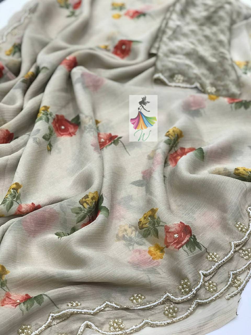 Chiffon Digital Printed Saree with Heavy Zardozi Cut Work Border and Pallu with Zardozi Blouse in Satin Printed Fabric