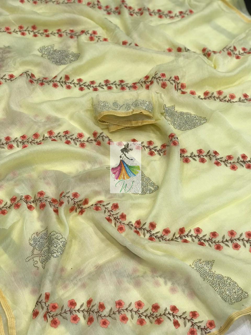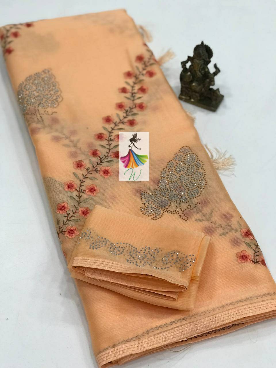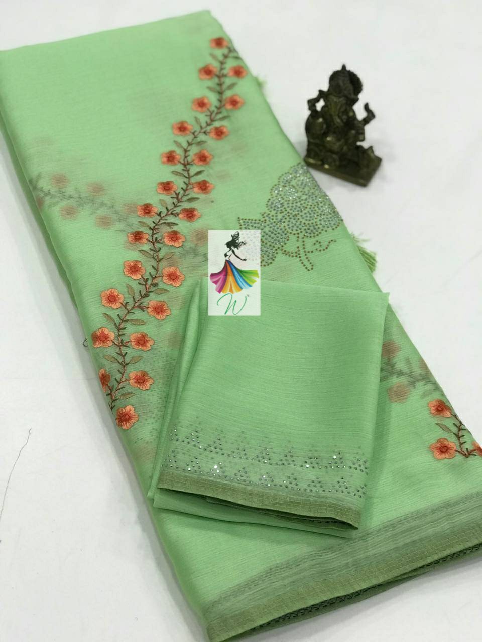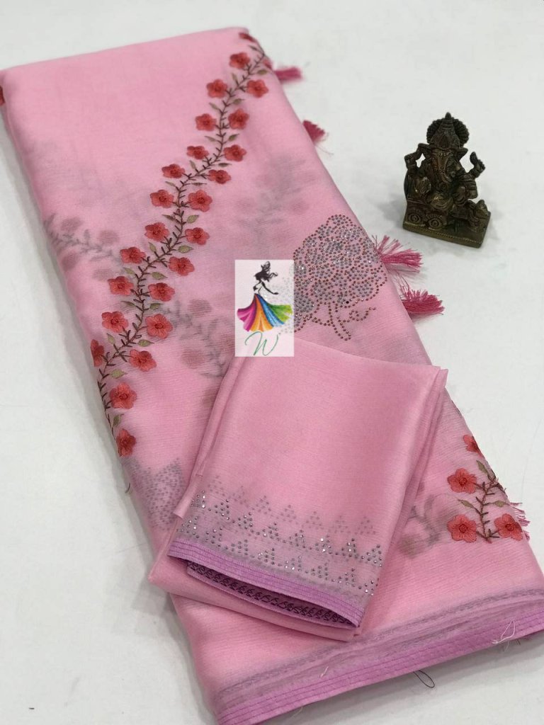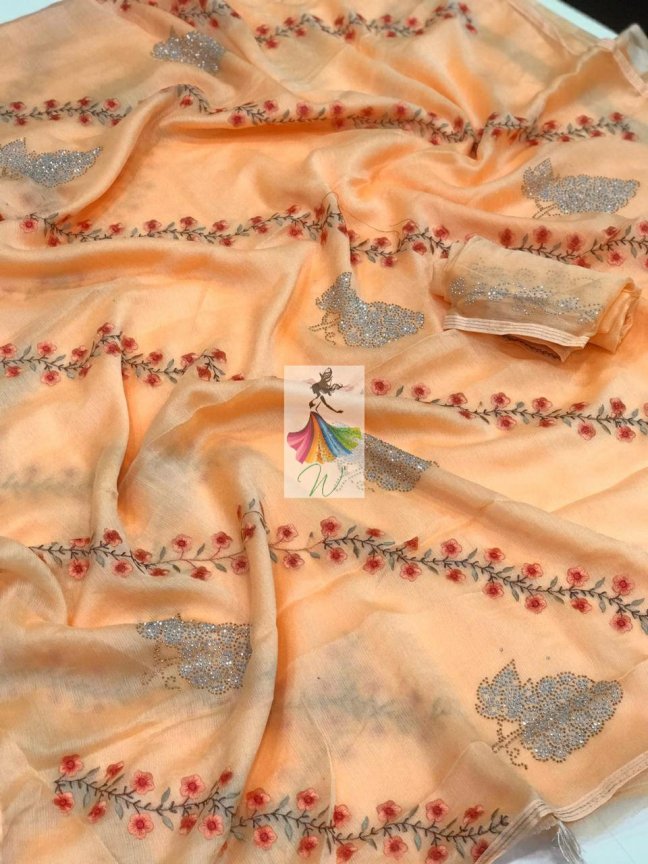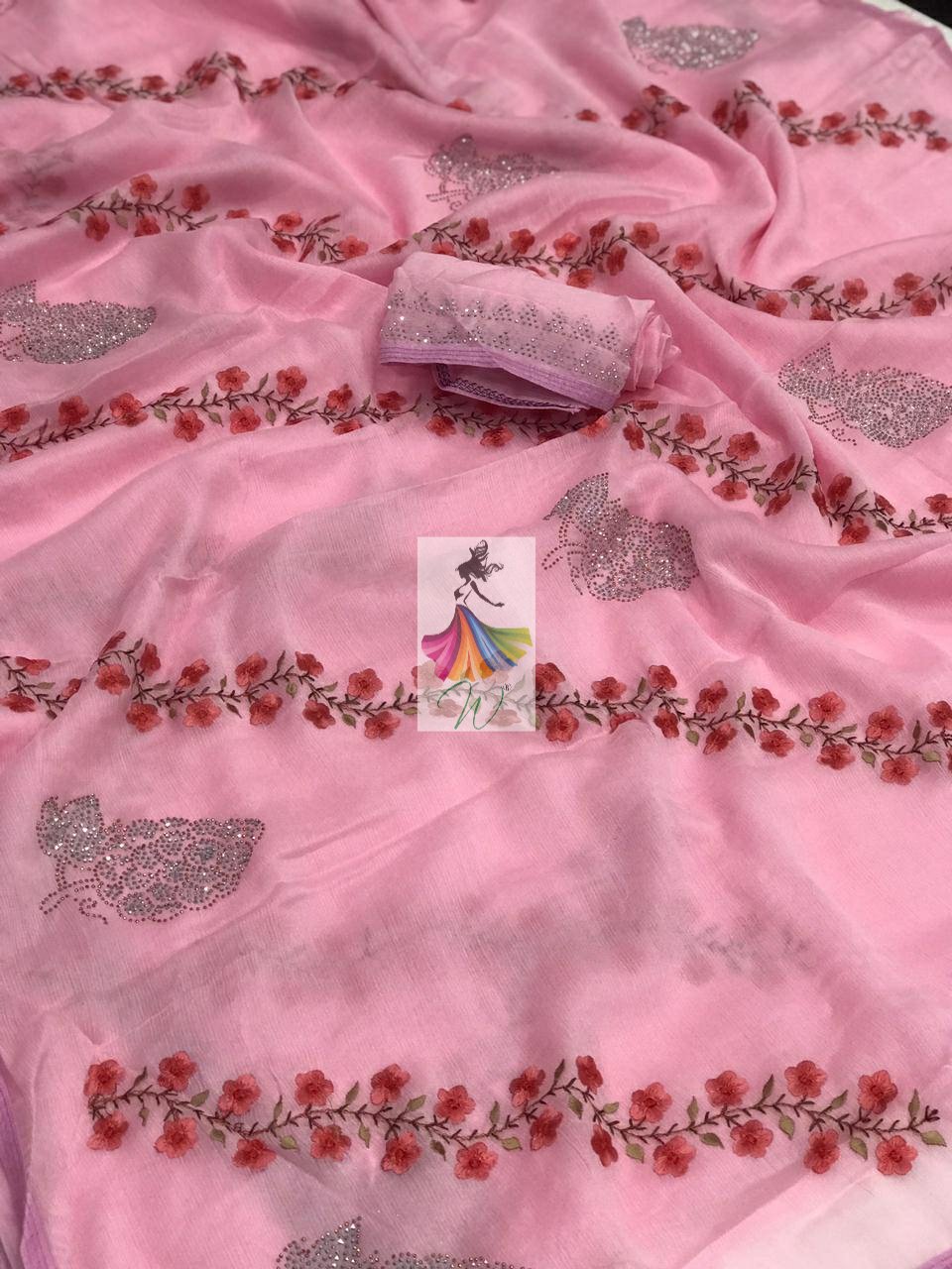 Chiffon Embroidery Saree with Glitter Stone work all over the saree and plain blouse with stone work