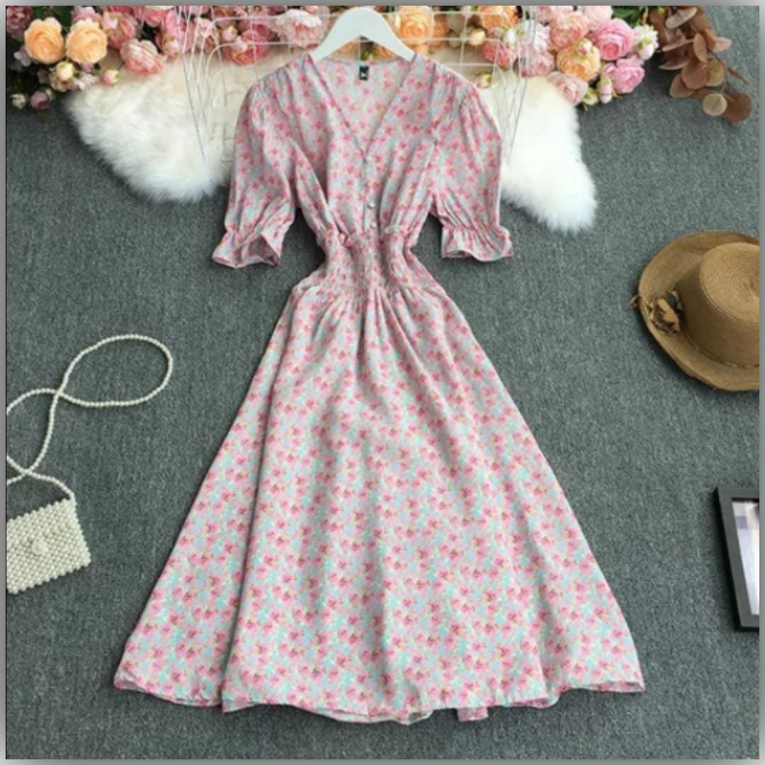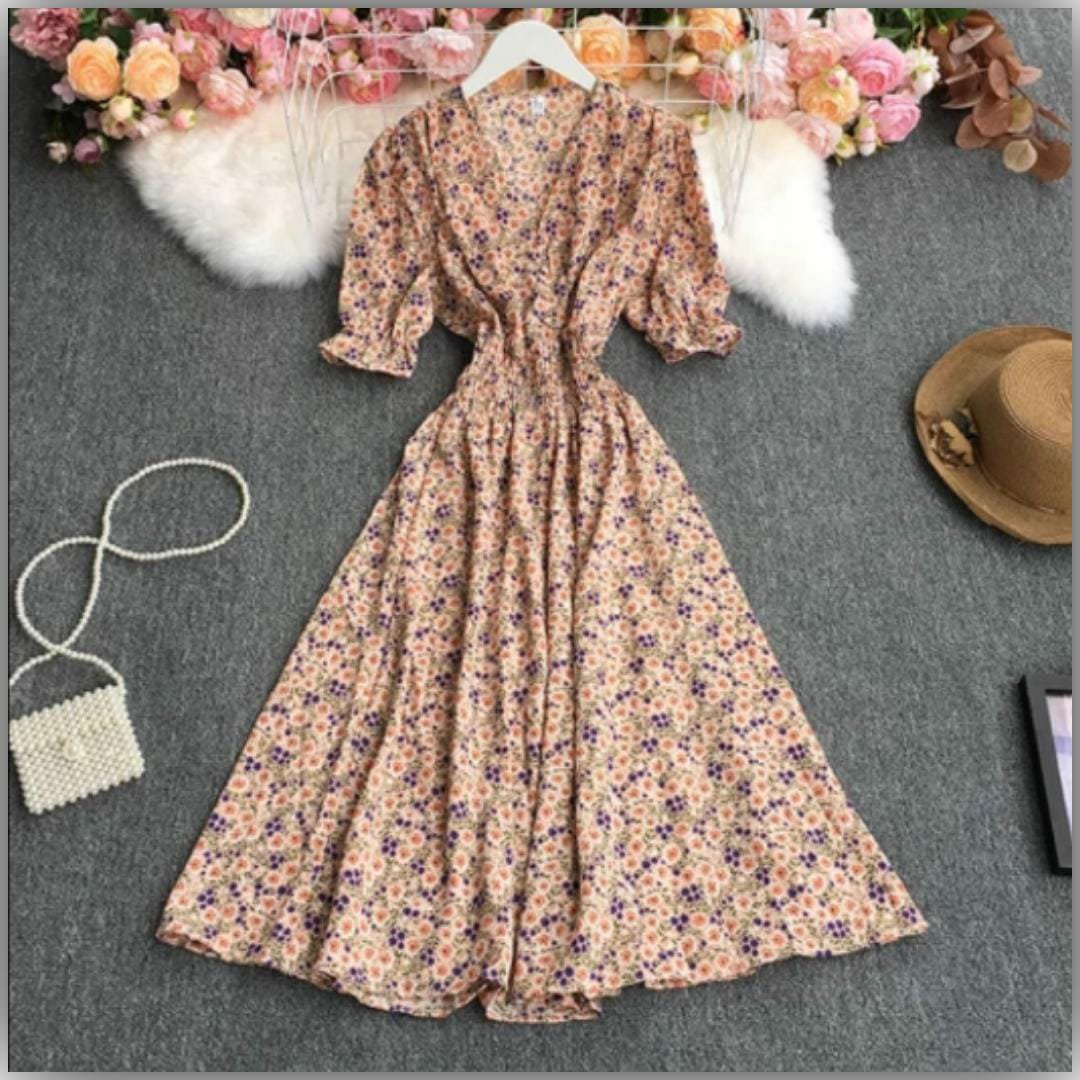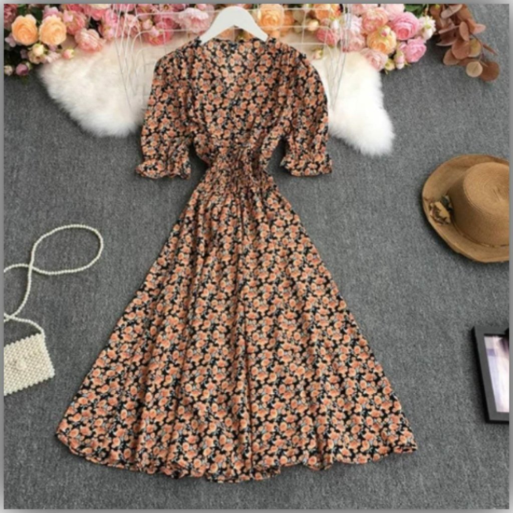 2021 New Summer Women French V-neck puff sleeve Dress high waist pleated waist floral print mid-length A-line Dress