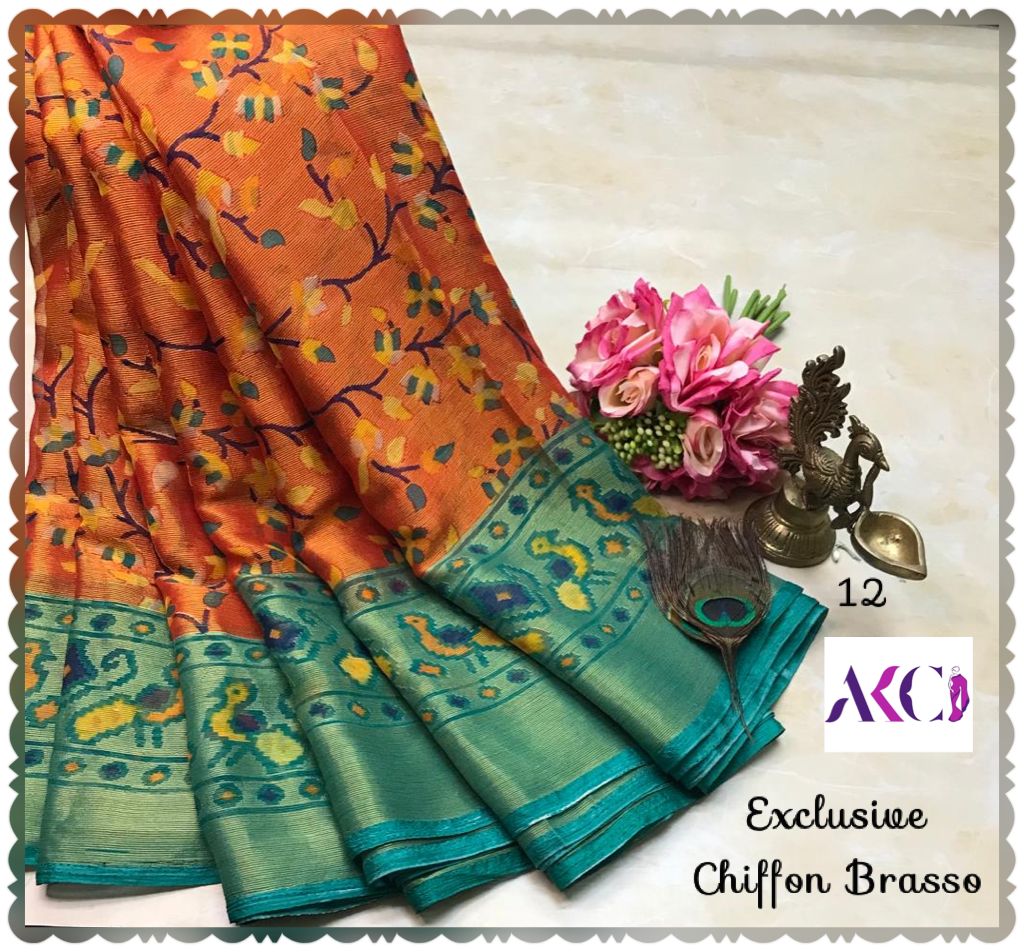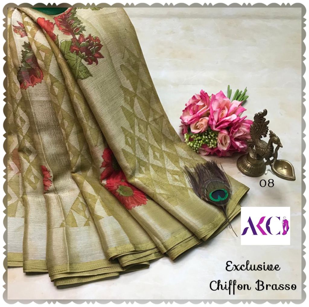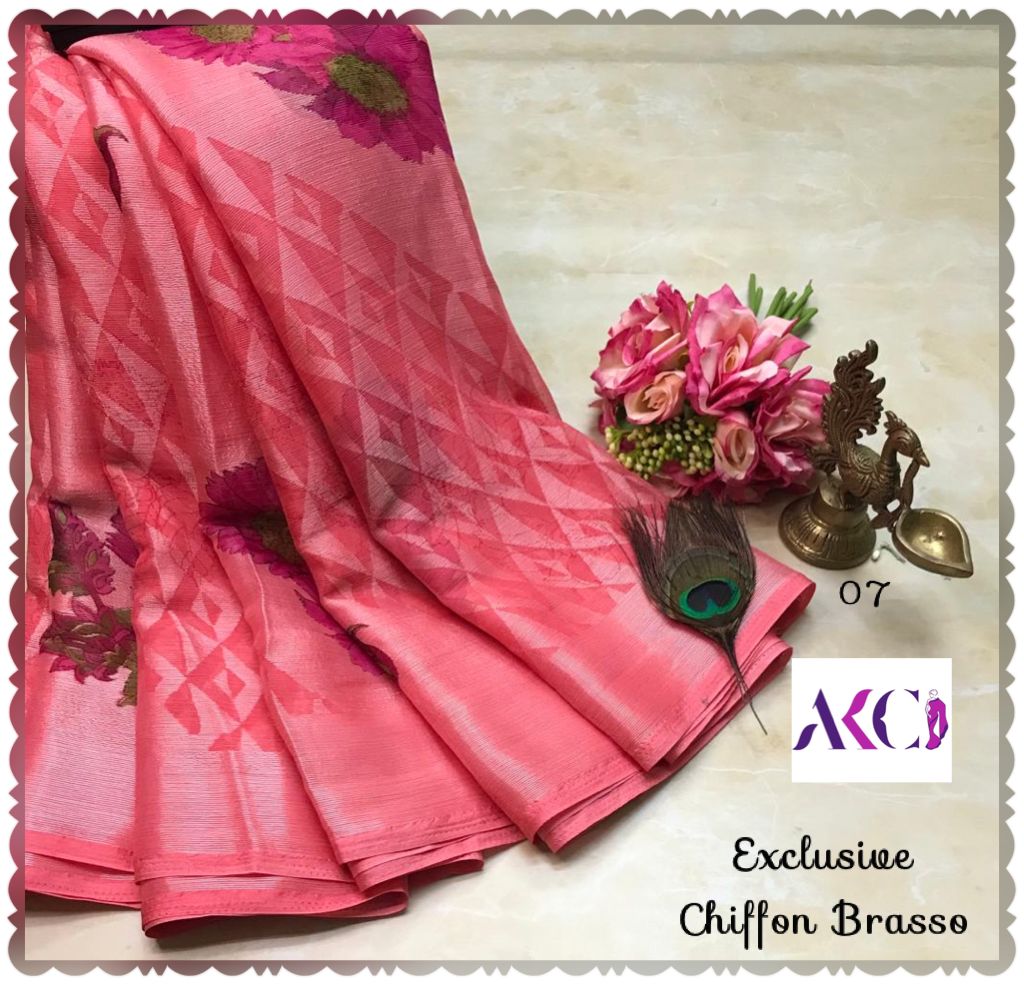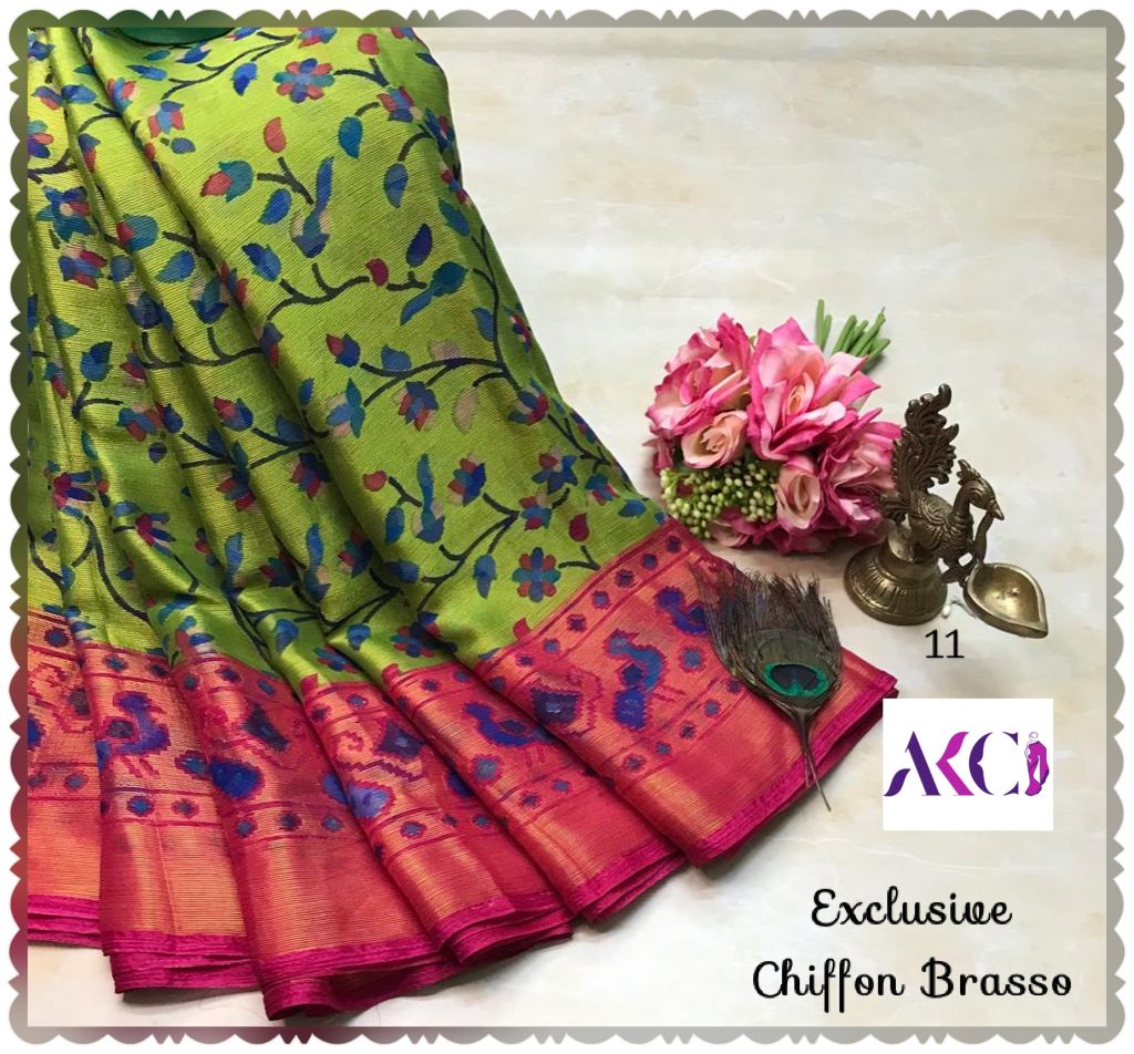 Premium quality chiffon Brasso sarees weaving with beautiful floral weaving all over saree and with exclusive border and pallu very soft comfy and easy to drape