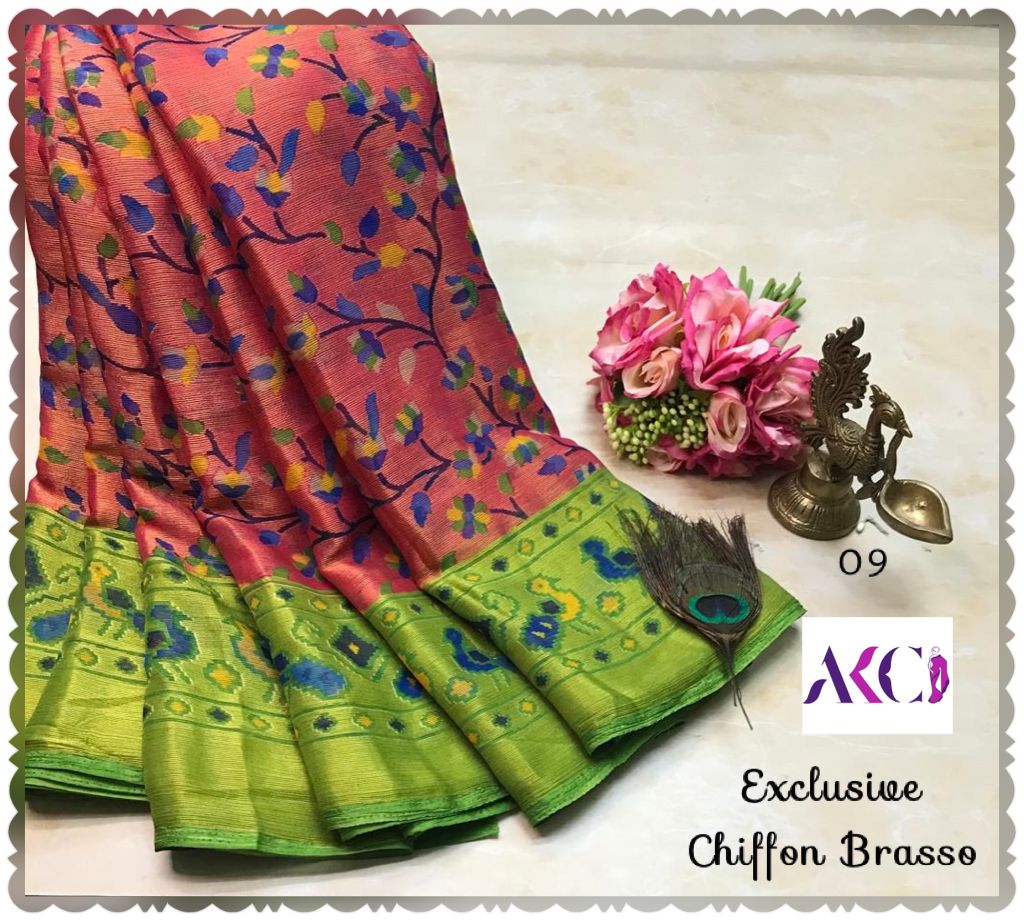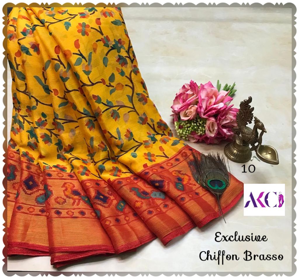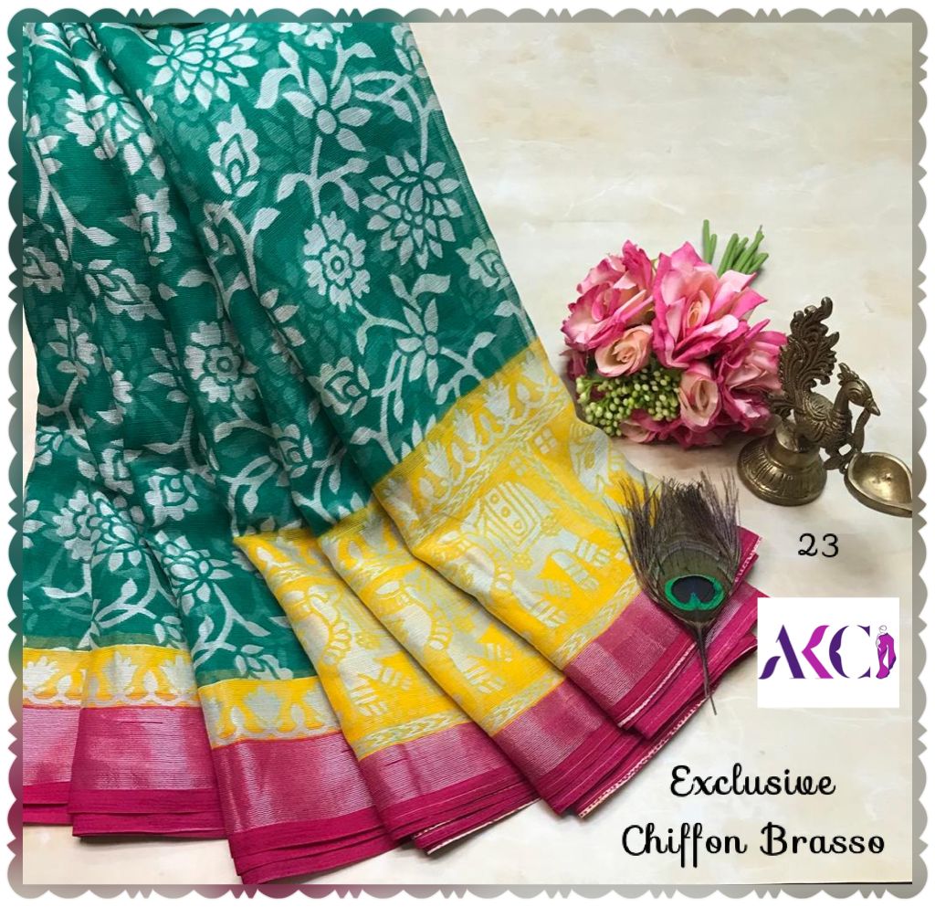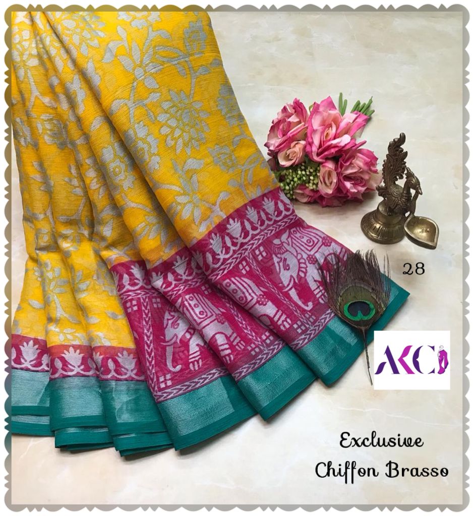 Premium quality chiffon Brasso sarees weaving with beautiful floral weaving all over saree and with exclusive border and pallu very soft comfy and easy to drape