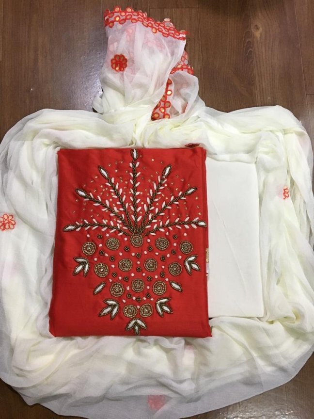 Top- Jam Cotton with Hand work, Bottom— Cotton, Dupatta –Naznin with gotapatti work MC Work- Hand work Rate- Rs899
