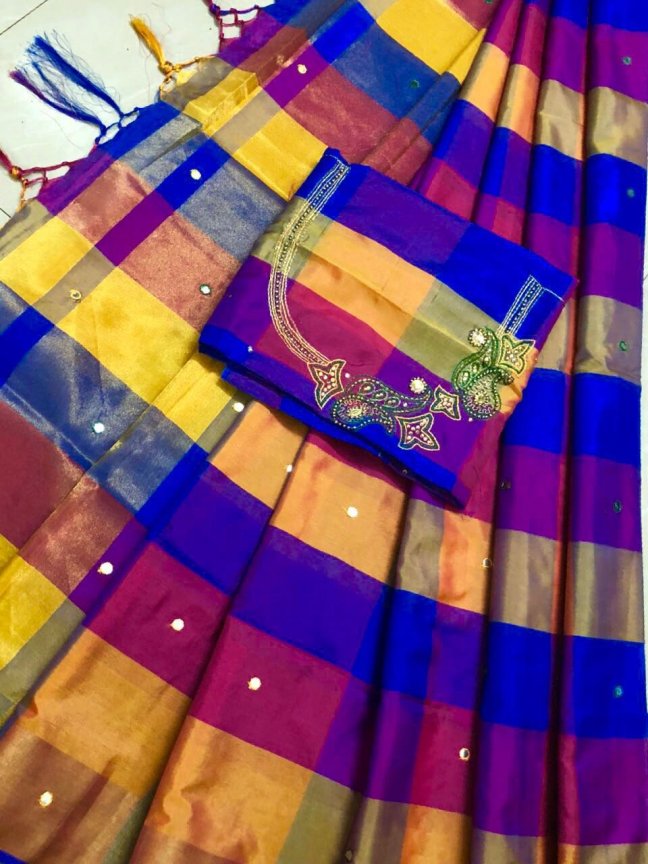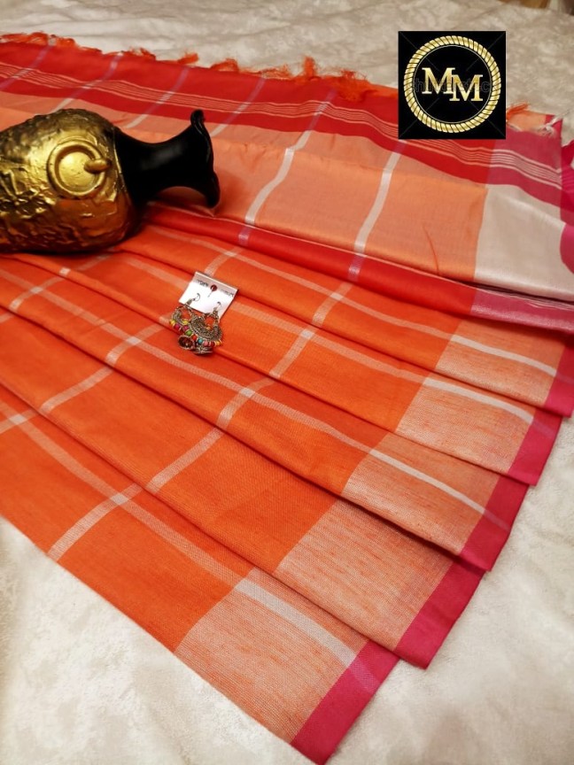 Checked linen saree with contrast border , pallu and running blouse Price-799+$ Buy extra german silver ear ring at 40 rs Limited stocks