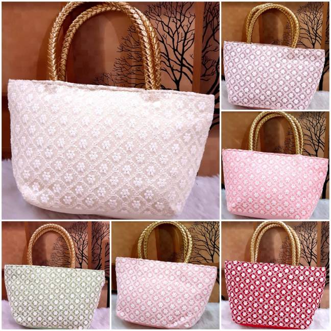 CHIKANKARI HANDLE BAGSINGLE PARTITIONBACK ZIPCAN BE PAIRED WITH TRADITIONAL AND WESTERN WEARBEST FOR GIVEAWAYS SIZE 10"×6"OFFER PRICE 349/-- shipping free