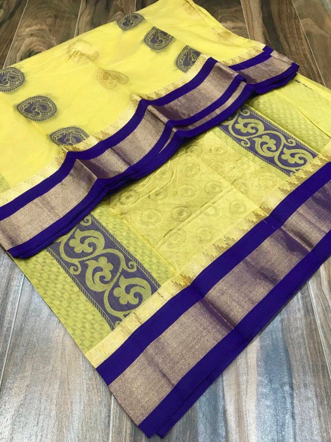 Details:- Banarasi Handloom Weaving *soft* Silk Saree LA *With Rich contrast Pallu N Rich Heavy Border* With Plain contrast Running Blouse n All Over Zari & mina Weaves 👉🏻Colours:- 4👈🏻 *Rate:- 1250/-