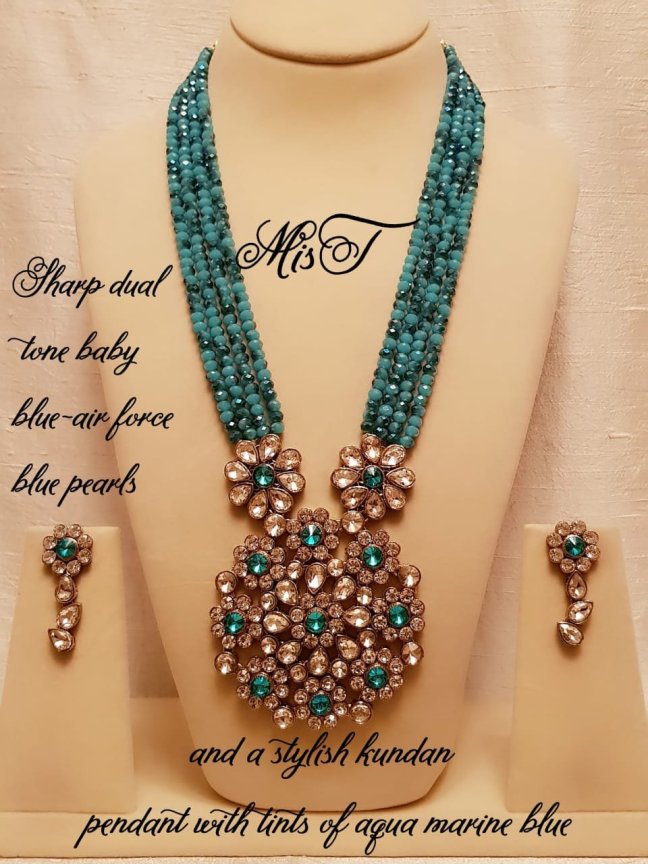 An exciting new range of bold kundan pendant malas in ultra stylish aqua marine premium quality shiny pearls strings. 1799/- free shipping /-