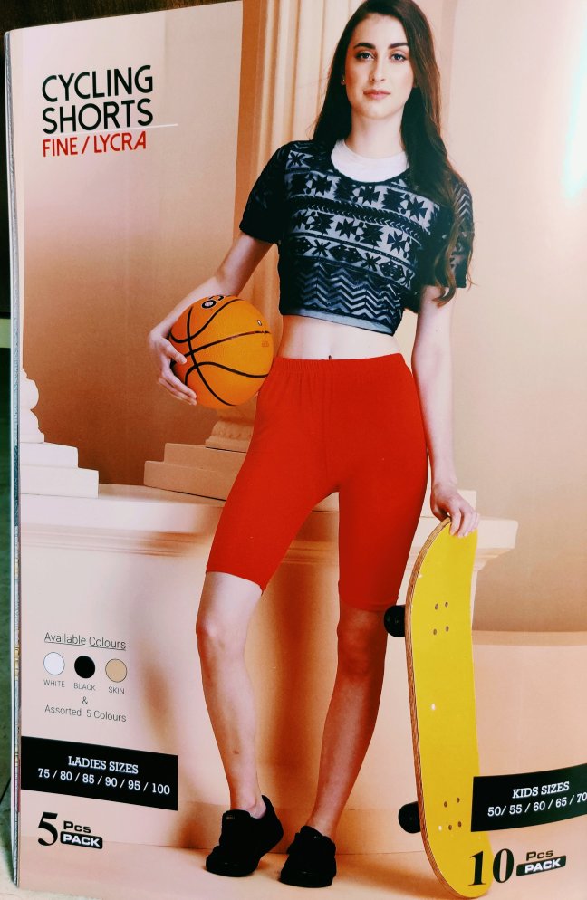 Cycling Shorts Fine and Lycra material Available colours White, Black, Skin & Assorted 5 colours Ladies Sizes: 75/80/85/90/95/100 Kids sizes: 50/55/60/65/70 Price for Fine material: 75- 80= 83/- 85- 90= 91/- 95-100= 99/- 105- 110= 115/- Price for Lycra material: 75- 80= 128/- 85- 90= 144/- 95-100=160/- Shipping charges extra