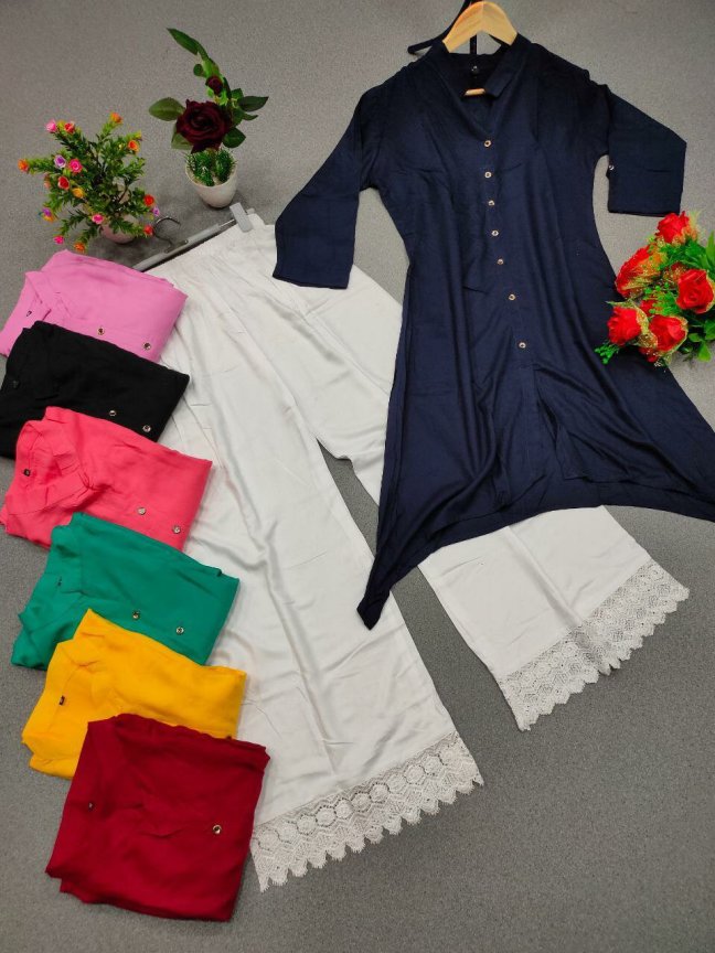 Triva Kurti : 14 kg. RayonKurti length:- 43+ Inch Plazzo :14 kg. Rayon with lace( Elastic waist )Plazzo Length :- 42+ inch 03 🌷Rate 999/- free shipping Type : Fully Stitched Size : M:38L:40"XL:42"XXL:44