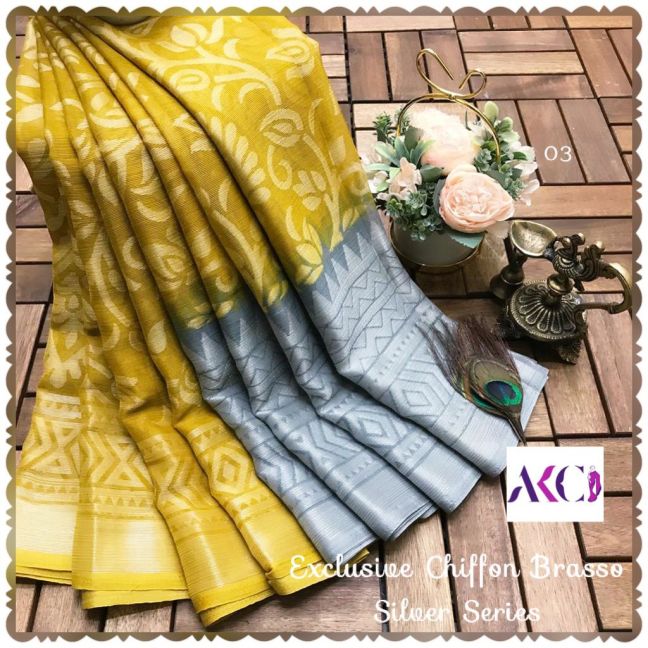 Premium quality chiffon Brasso sarees in silver shades weaving with beautiful floral weaving all over saree and with exclusive border and pallu very soft comfy and easy to drape Saree with contrast blouse Price: 1050/- free shipping Note:These are premium quality soft exclusive Brasso sareesDaily Wear SareeEasy MaintenanceWashable and Durable 01