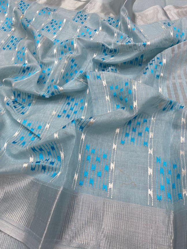 Uppada Jute Lenin saree with Ethnic Kanchi borders sarees Jacquard border Nice Shibpur Prints Allover & Rich contrast Tye & dye Pallu Paired up with nice contrast blouse as in pic kb Price: 1330/- free shipping