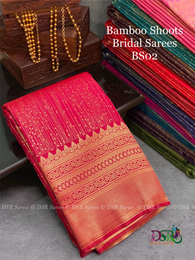 Banarasi Bamboo shoots Kanchi Semi Silk Bridal ππ΄π πΈπΈπ Fusion of Banarasi and Kanjivaram patternsβ¦β¦.. With delicately crafted golden zari bamboo shoots all over the body.. Rich Palluβ¦β¦. Price: 1799/- free shipping Multiples avlβ¦. Book urs soonβ¦